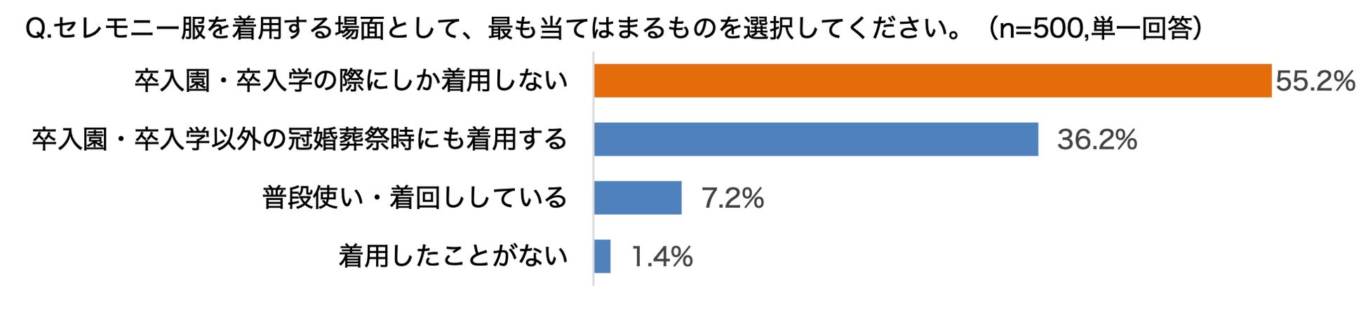 また、実際にセレモニー服を着用する場面を聞くと、半数以上(55.2%)が「卒入園・卒入学の際にしか着用しない」と回答しており、クローゼットのなかで眠ってしまっているという実態も明らかになりました。