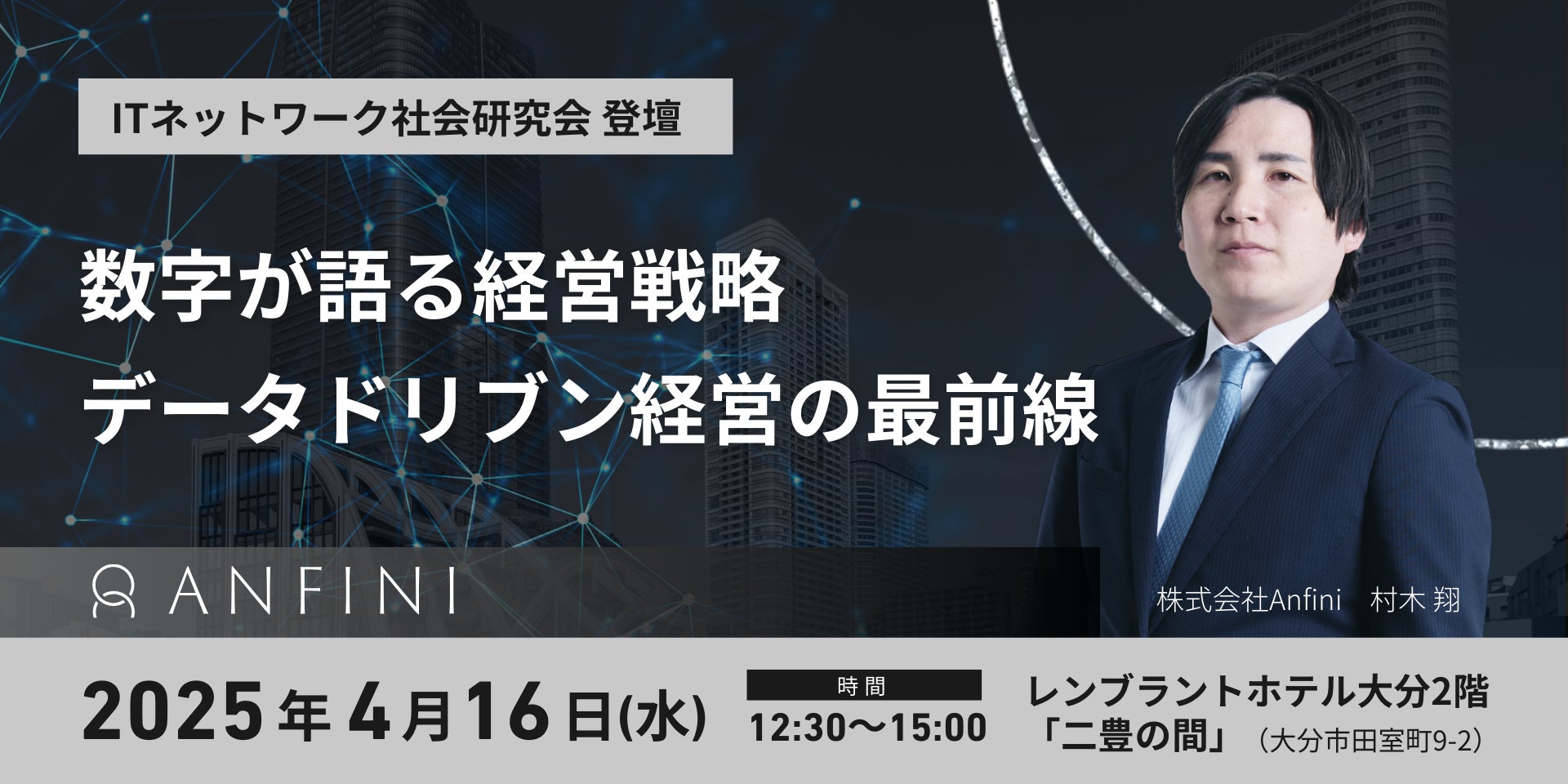 2025年4月16日(水)、株式会社Anfini(本社:東京都港区、代表取締役:橋本 純)の執行役員CSO 村木翔が、大分ITネットワーク社会研究会主催の講演イベントに登壇いたします。