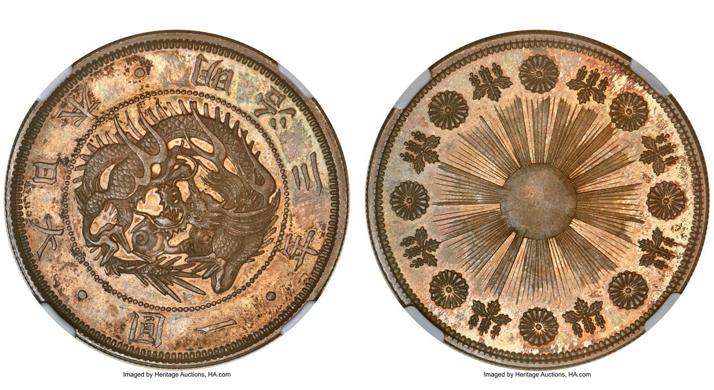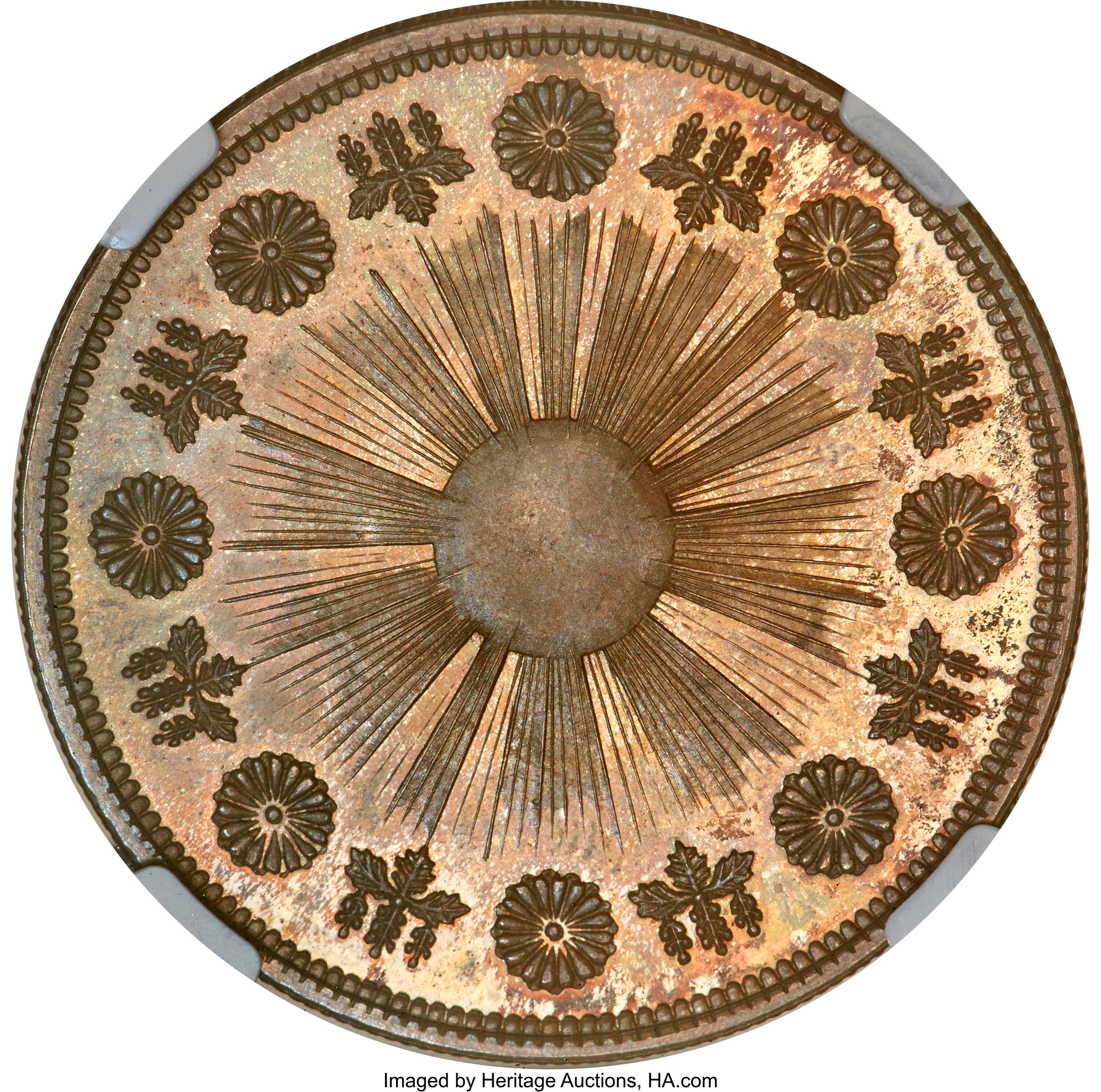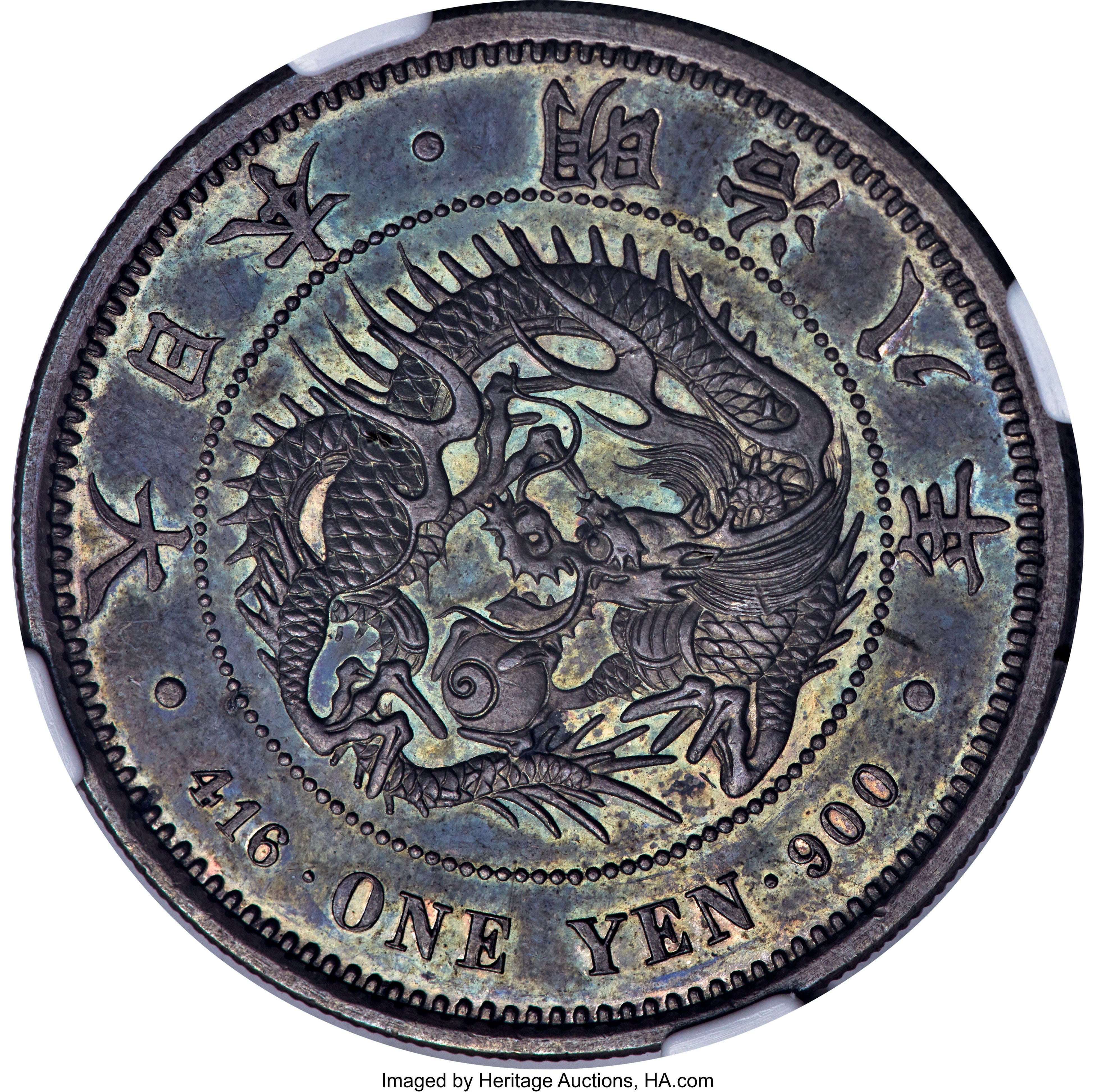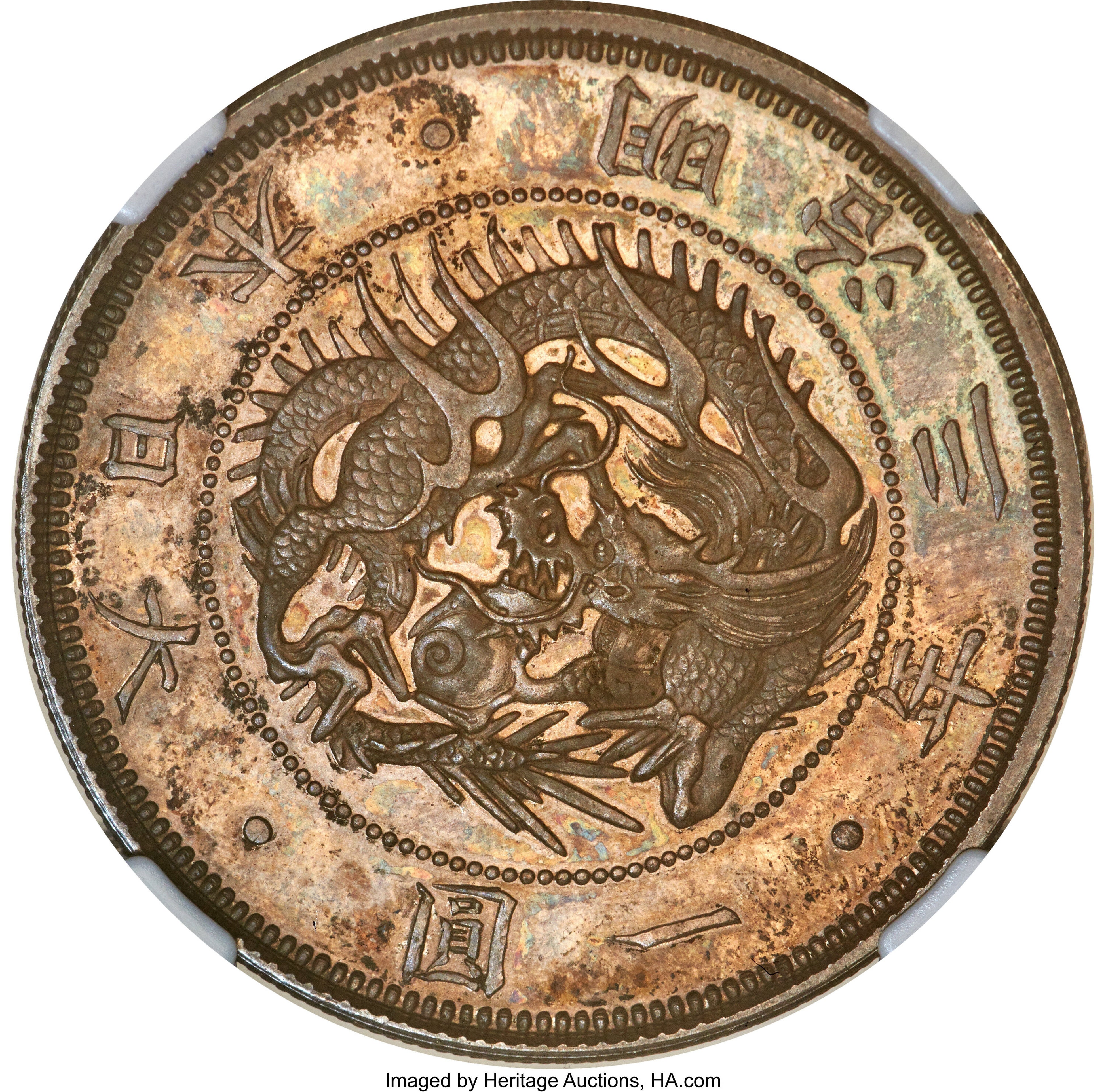 日本が海外貿易決済用に発行した貿易銀の試鋳貨で、明治7年(1874 年)に製作された2種類の試作のうちのひとつ。竜図が枠に囲まれていないデザインで、鉛色と琥珀色のトーンが幻想的な印象を与えています。NGCに登録されている2枚のうち上位グレードの1枚であり、近年のオークションに登場した唯一の個体として白家コレクションを代表する日本コインのひとつです。