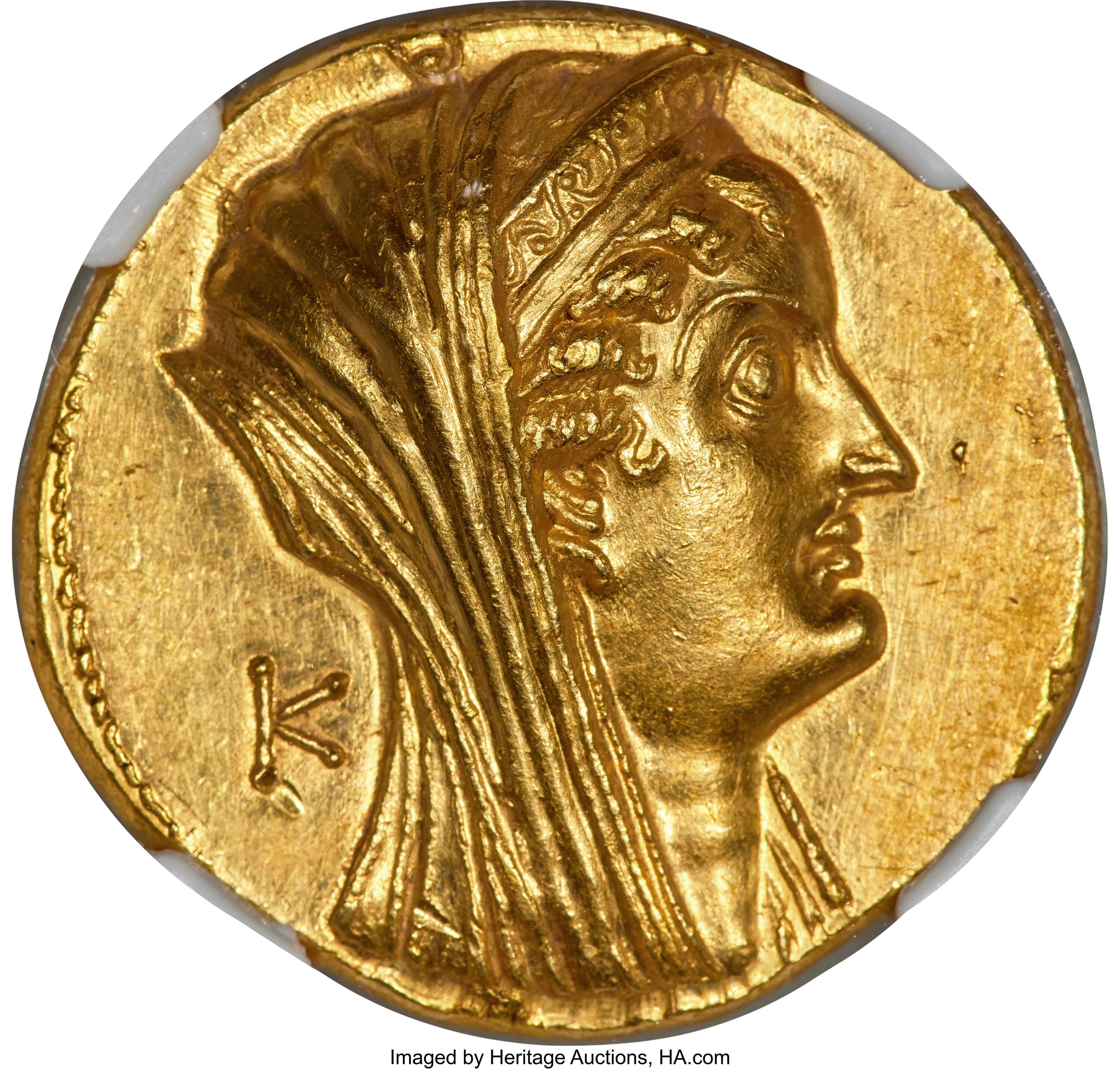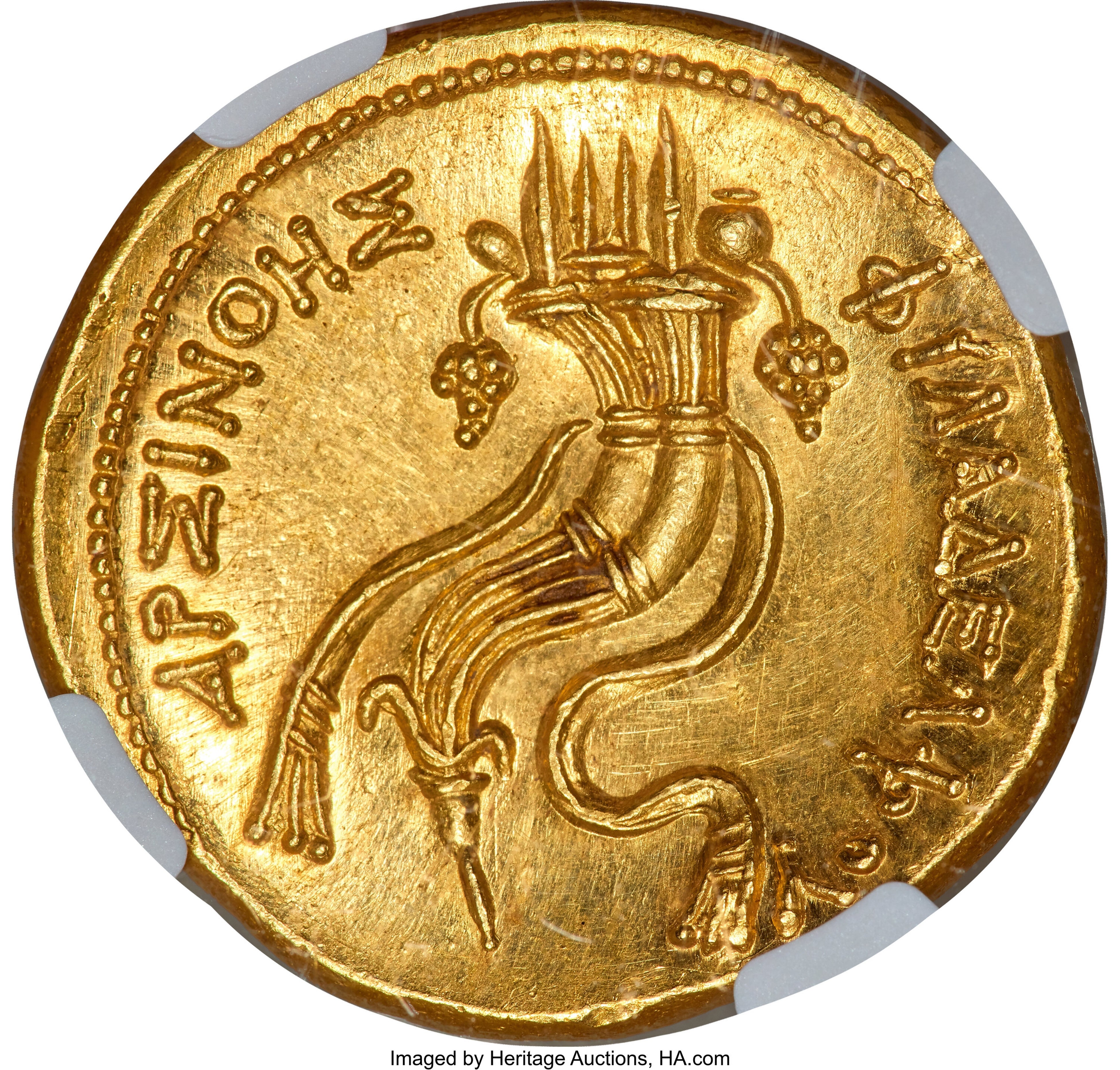 人気の高い古代エジプトの大型金貨。表面には王冠を戴き、ヴェールを被ったアルシノエ2世の肖像、裏面には「フィラデルフォスのアルシノエ」の銘文と、リボン飾りのついた二重の豊穣の角(コーヌコピア)が描かれています。細部までしっかりと刻まれており、鏡面のような光沢を湛える印象的な1枚です。