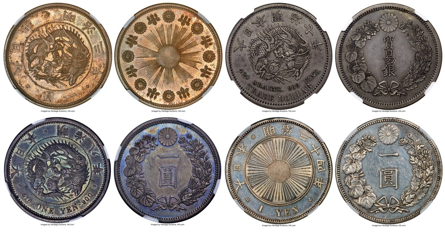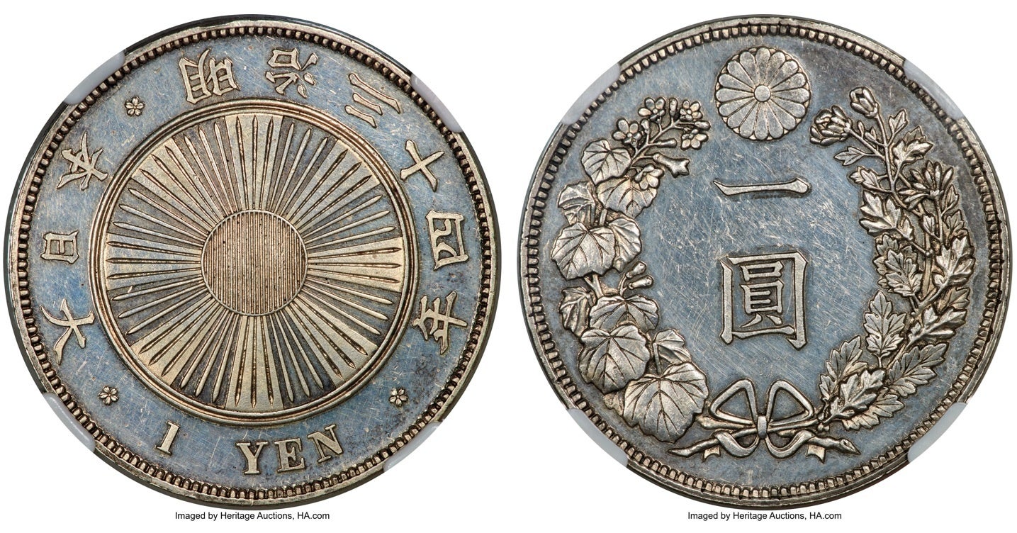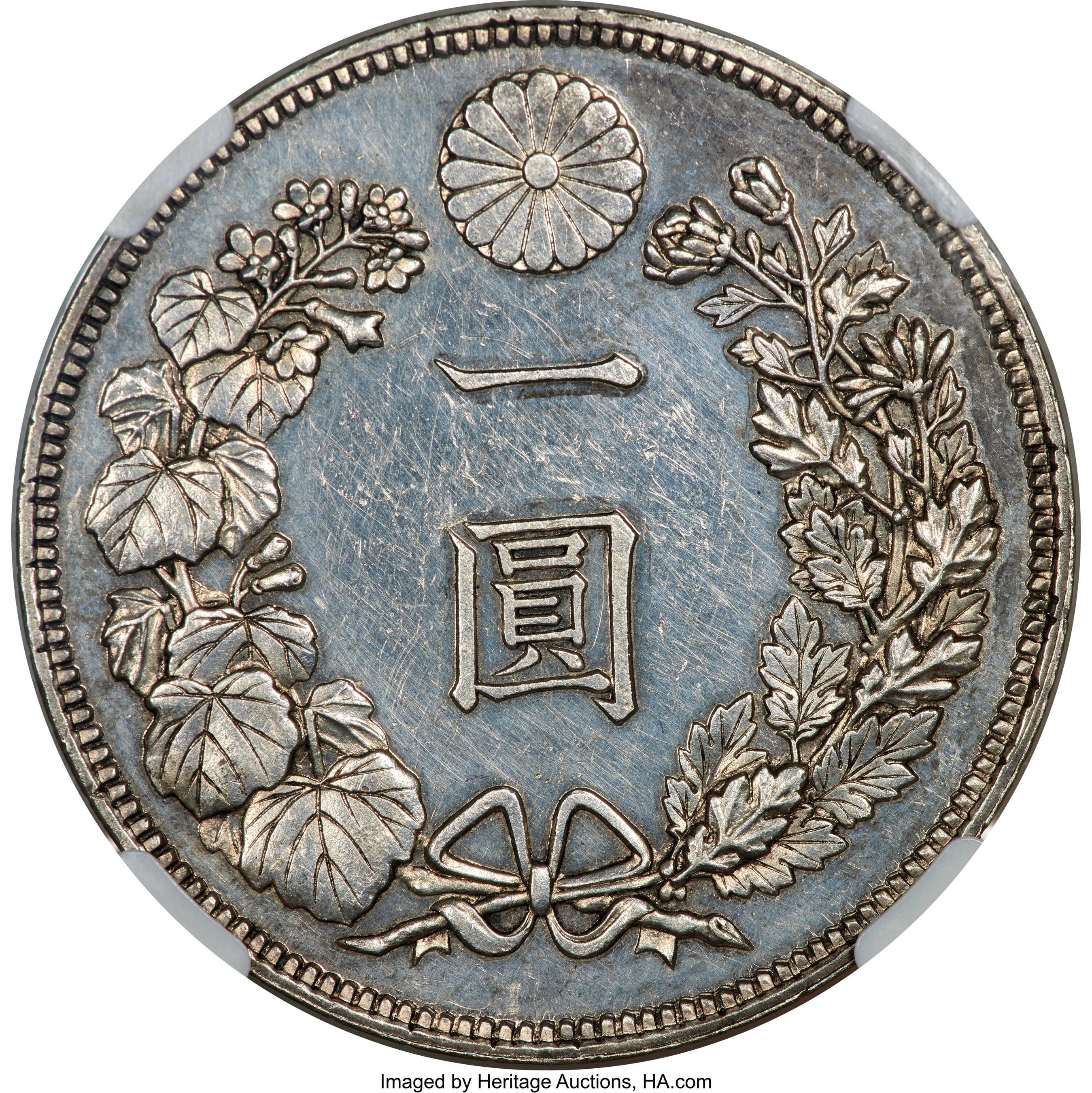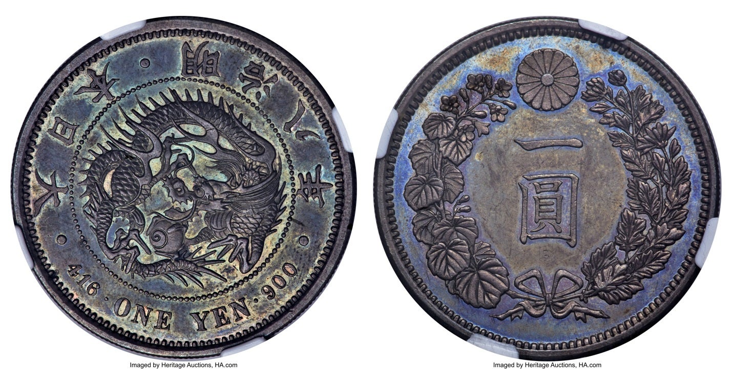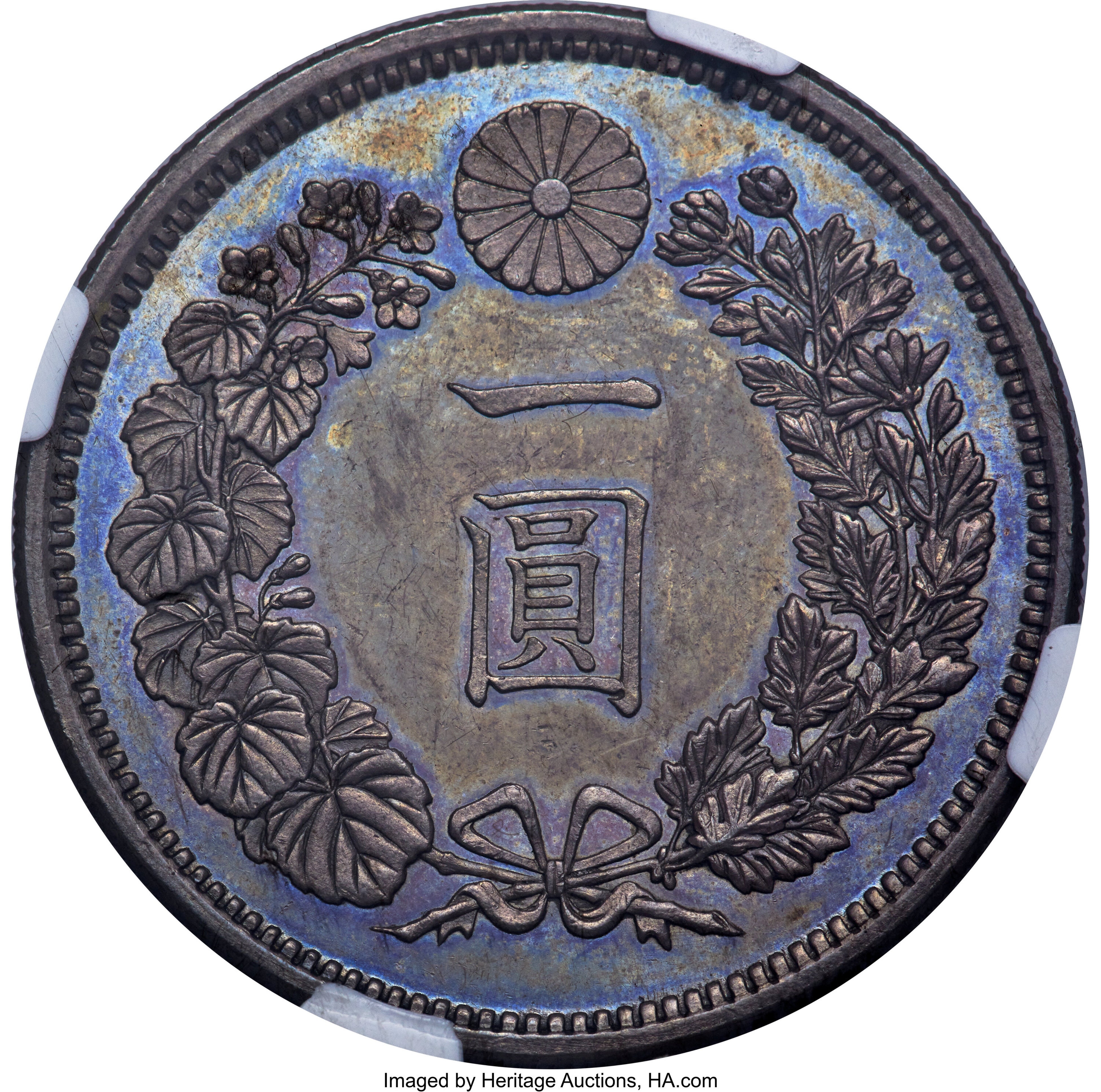 明治1円銀貨の中で、最も発行枚数が少ない明治8年銘。稀少年号であることに加え、本品は国際的な鑑定機関から最高水準のグレード評価を受けており、シャンパンゴールドとブルーの美しいトーンが際立つ1枚です。旧Dr. Norman Jacobsコレクションを代表するコインのひとつでもあり、高額落札となりました。