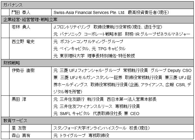 (注)若林勇人氏、伊勢谷直樹氏、西立野竜史氏、星友啓氏、黒田淳氏並びに森山真有氏は社外取締役候補です。門田泰人氏は常勤取締役候補者です。但し、議題2が承認され、門田泰人氏が取締役会議長となる場合には社外取締役となる予定です。なお、門田泰人氏は提案株主の運用者であるSwiss-Asia Financial Services Pte. Ltd.の最高投資責任者であることから、株主と取締役間の実質的な利益相反を避けるため、当社取締役に選任された場合であっても、当社からの役員報酬は一切辞退致します。