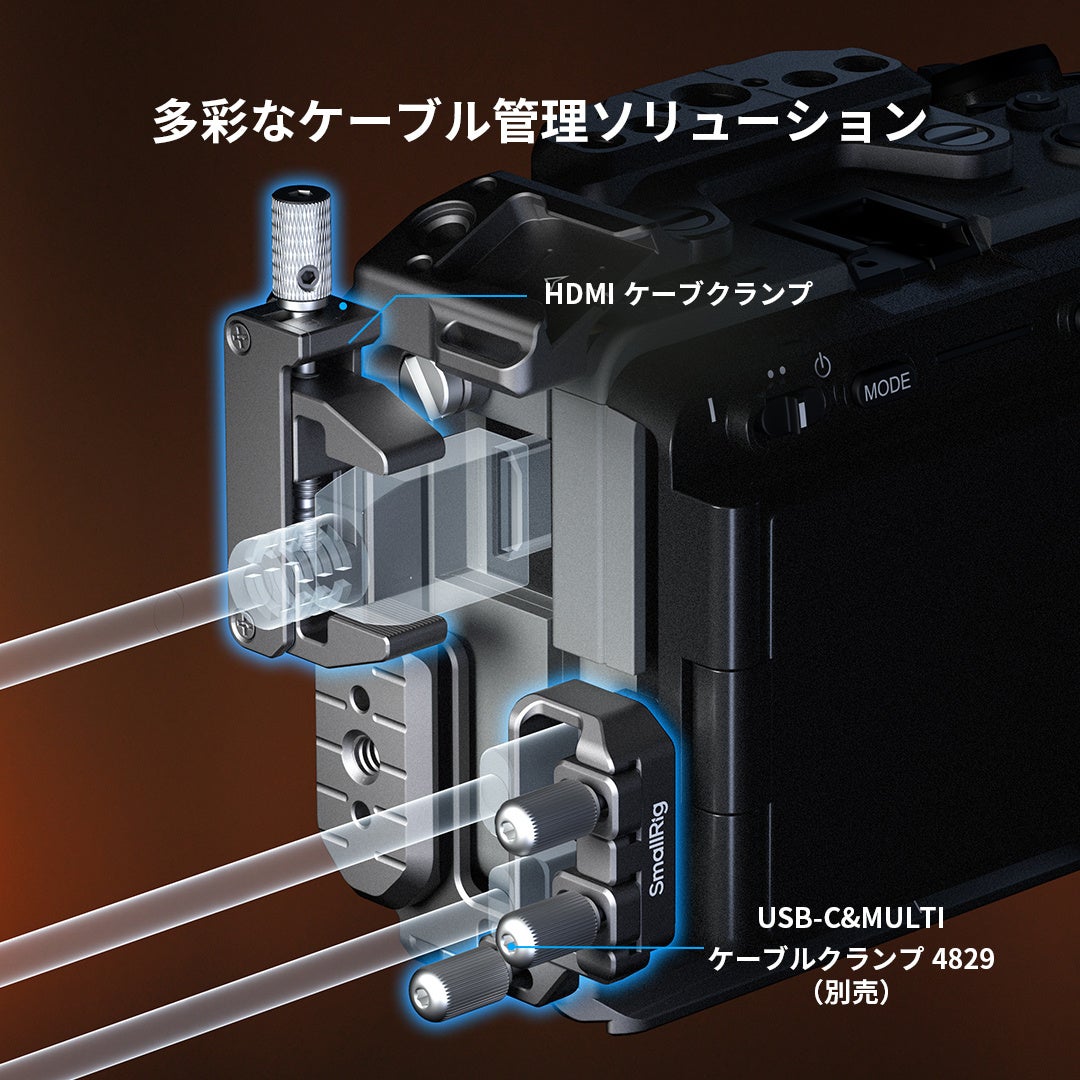 安定した信号伝送を保証するためのHDMIケーブルクランプも付属しており、USB-C&MULTIケーブルクランプ4829(別売)はノブでケージに素早く取り付け、信頼性の高いデータ転送を確保します。