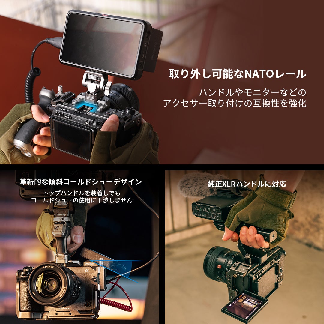 上部のNATOレールは取り外し可能で、カメラ本体のホットシューマウントの使用に干渉せず、ハンドルやモニターなどのアクセサリー取り付けの互換性を強化します。NATOレールを取り外すと、純正のXLRハンドルを装着できます。革新的な傾斜コールドシューデザインにより、トップハンドルを装着してもコールドシューの使用に干渉しません。