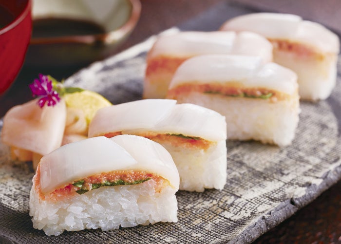 いかと酢飯との相性を考えた粒明太子を新たに開発。通常の粒明太子に比べ粒立ち良く仕上がった押し寿司専用の明太子をたっぷりと使用しています。