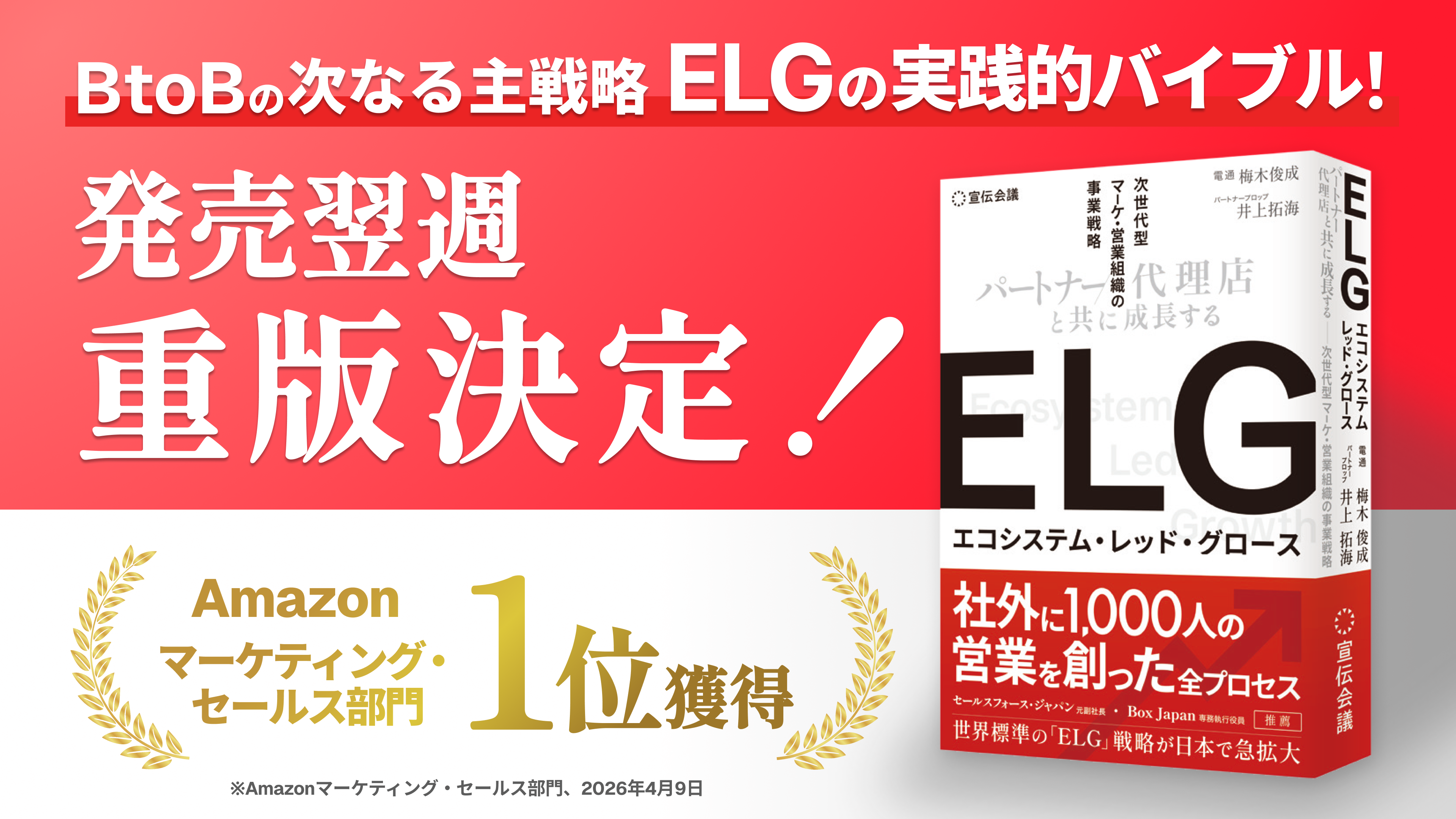 2026年4月9日の発売後、本書はAmazonの「マーケティング・セールス」カテゴリで発売初日に1位を獲得し、Amazonでは一時的に品切れとなるなど、多くの反響をいただきました。パートナービジネスや代理店戦略に携わる実務家に加え、BtoB事業におけるマーケティング、営業、事業開発、経営企画など幅広い領域の方々から支持を受け、このたび重版が決定しました。