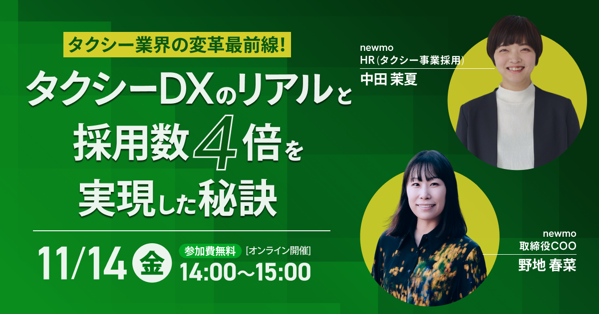 newmo株式会社(本社:東京都港区、代表取締役CEO:青柳直樹)は、タクシー会社向け無料オンラインセミナー「タクシー業界の変革最前線 ― タクシーDXのリアルと採用数4倍を実現した秘訣」を2025年11月14日(金)に開催いたします。