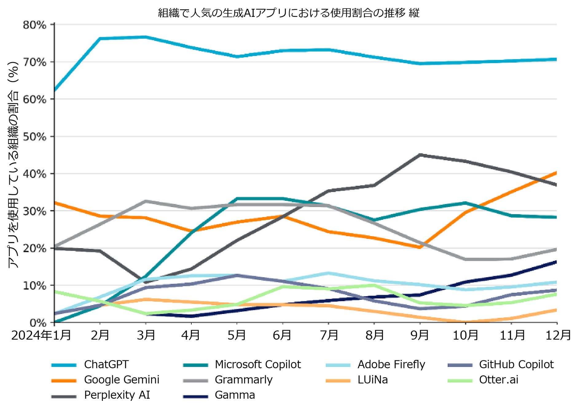 日本における生成AI全体の成長は比較的限定的である一方で、Perplexity AIなどのプラットフォームの急速な成長は、セキュリティ面で安全性が確保された生産性向上に役立つツールへの高い需要を示唆しています。