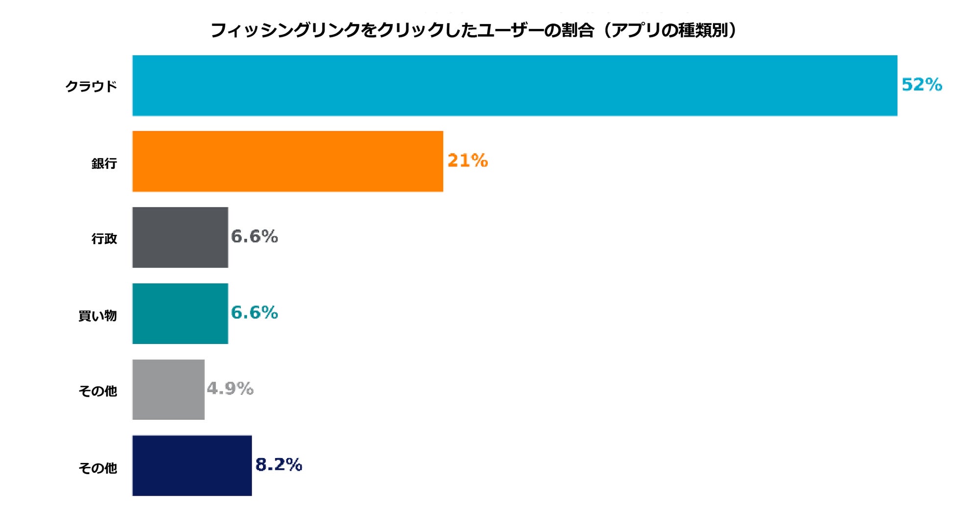 2024年の調査によると、職場の主要なクラウドプラットフォームにおいて、毎月1,000人に1人の割合でマルウェアのダウンロードが試みられています。さらにフィッシング被害は深刻で、毎月1,000人あたり3.7人がフィッシングリンクをクリックしている実態が明らかになりました。これらのフィッシングキャンペーンの大半(52%)がクラウドアプリケーションの認証情報を狙ったもので、銀行の認証情報を狙ったもの(21%)を大きく上回っています。