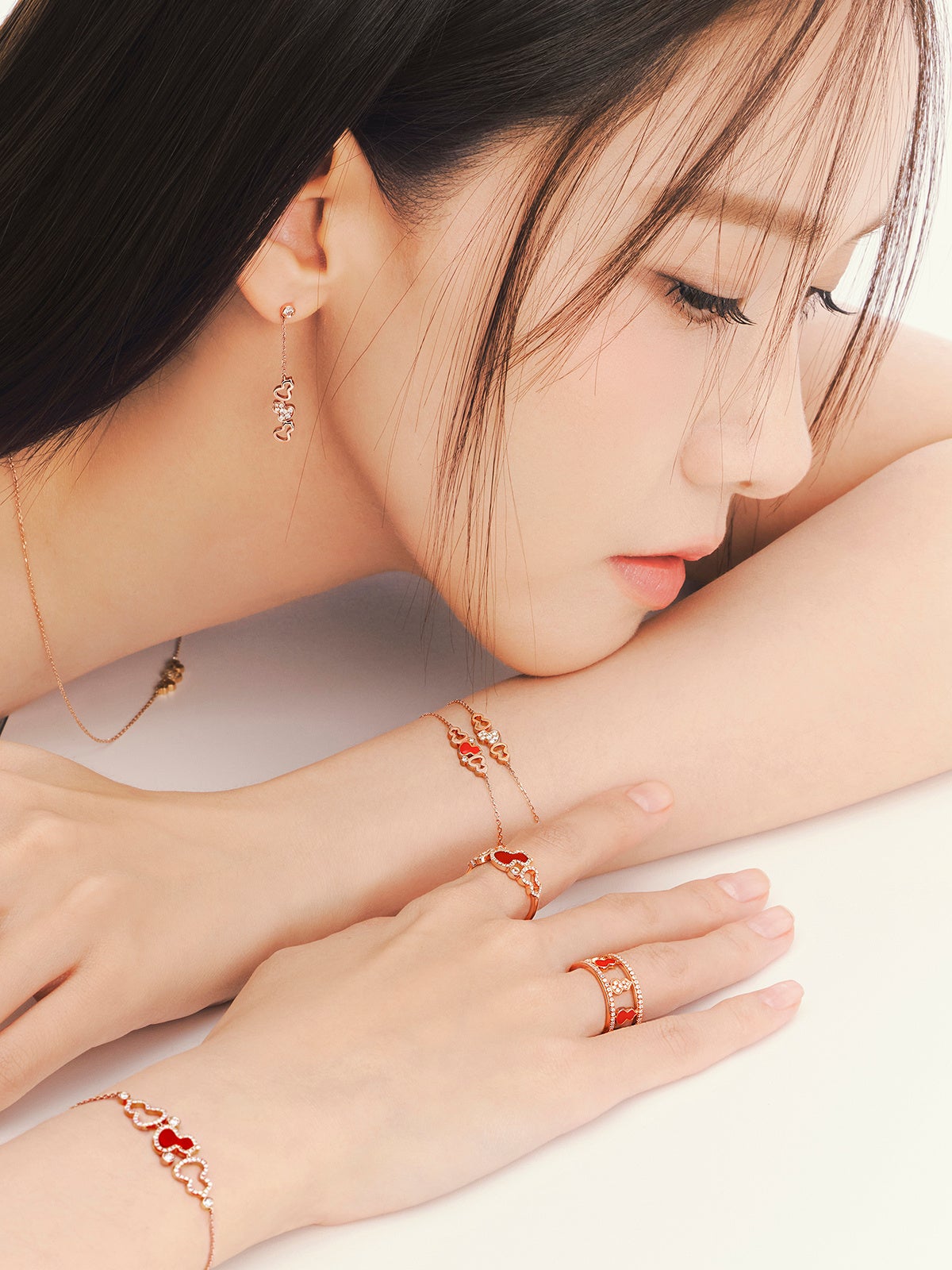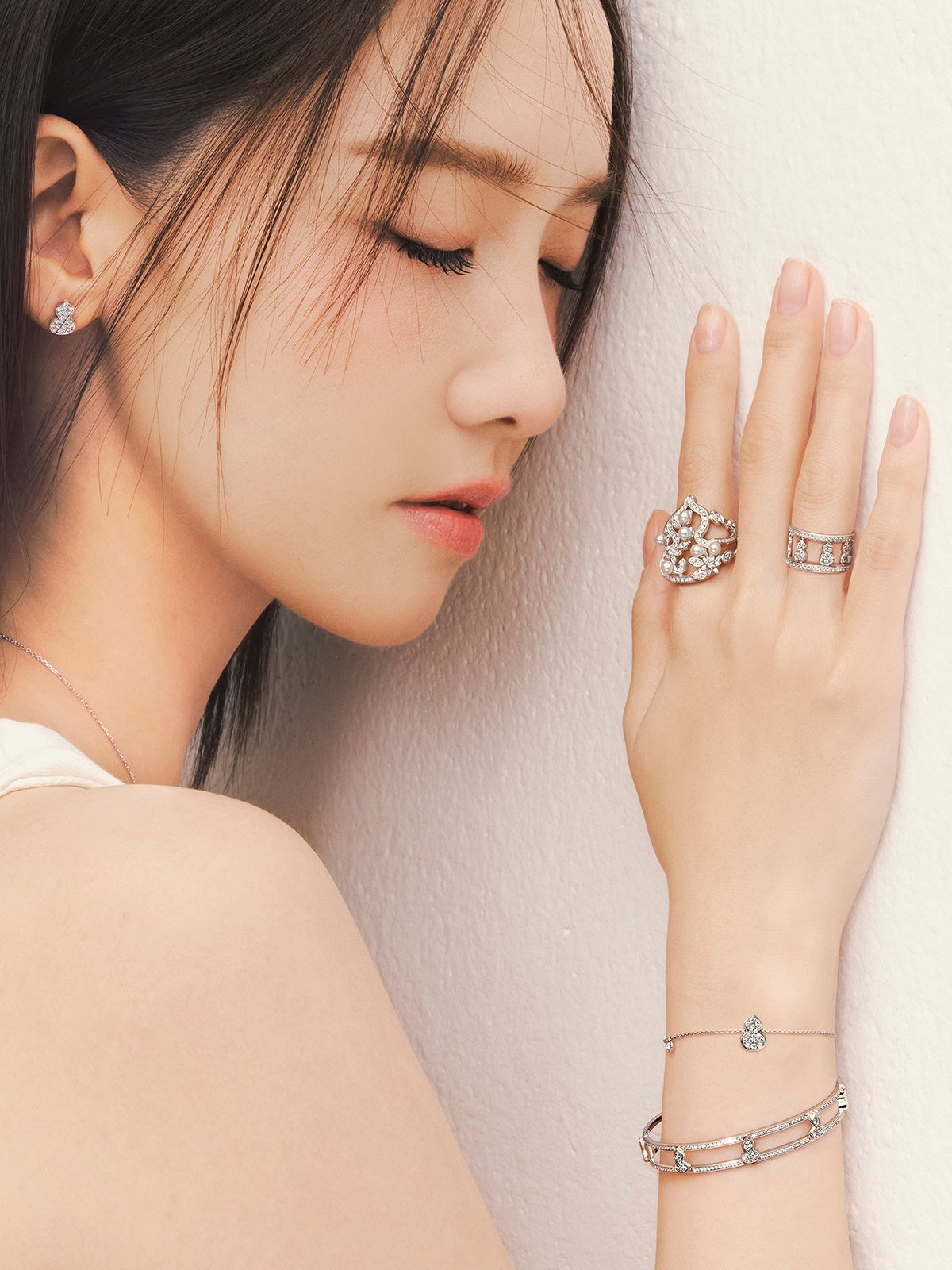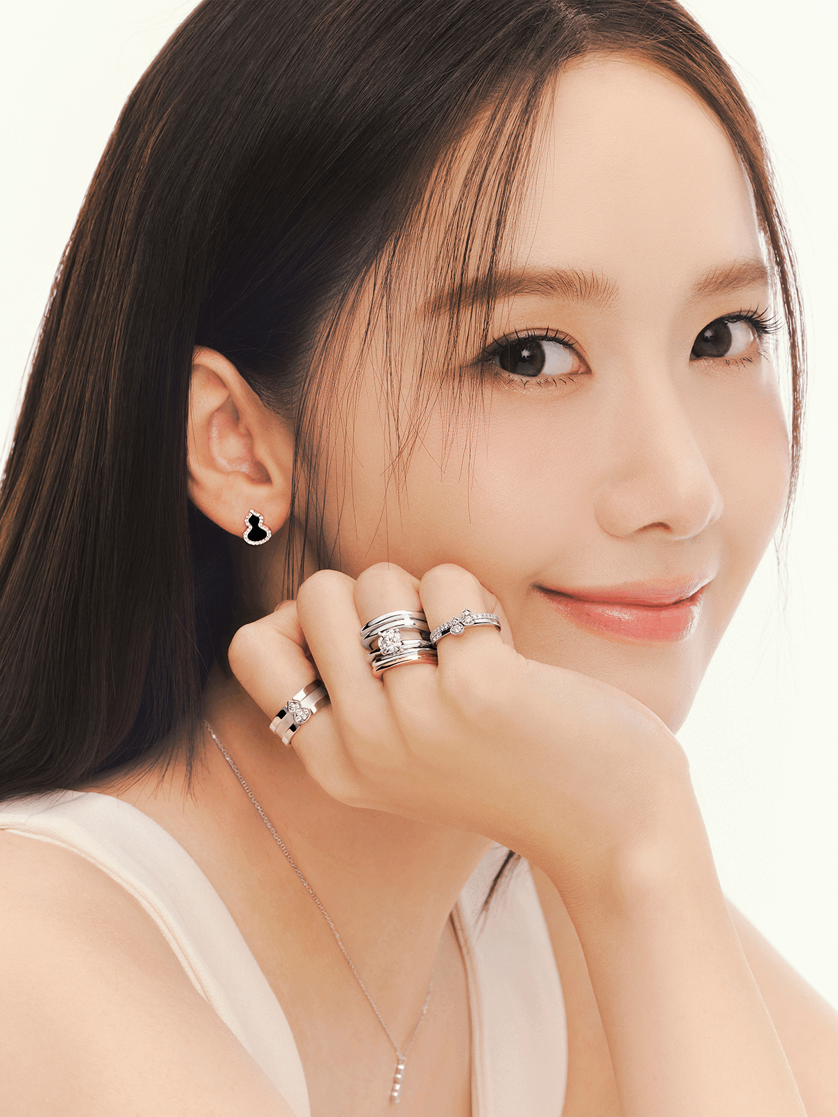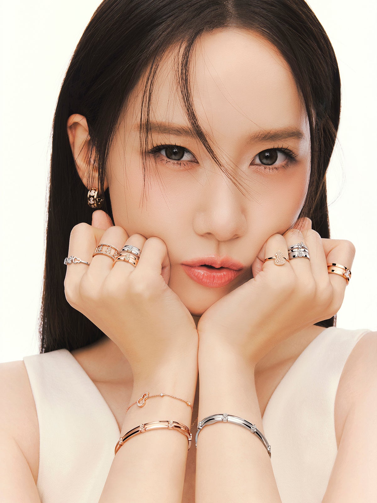 春の物語を静かに結ぶように、Yoona は〝 Wulu Mini Solitaire 〟と〝 Tien Di 〟のリングを、ホワイトゴールドとローズゴールドが織りなすモダンなコンポジションで纏います。研ぎ澄まされたラインと純粋なフォルムが、ミニマルな美意識による洗練を映し出します。控えめでありながら確かな存在感を放つこれらのリングは、永遠の誓いと現代的なエレガンスを静かに物語ります。