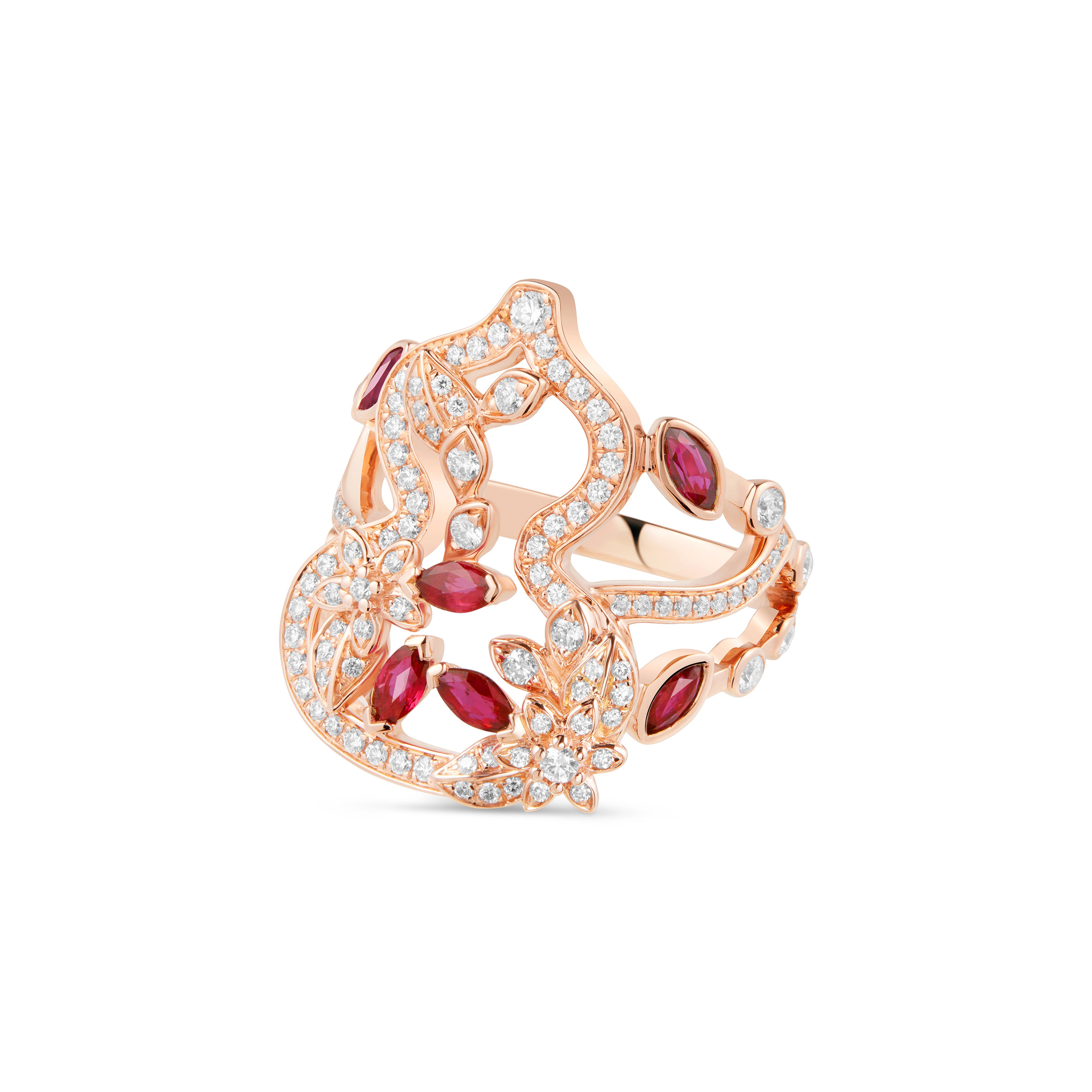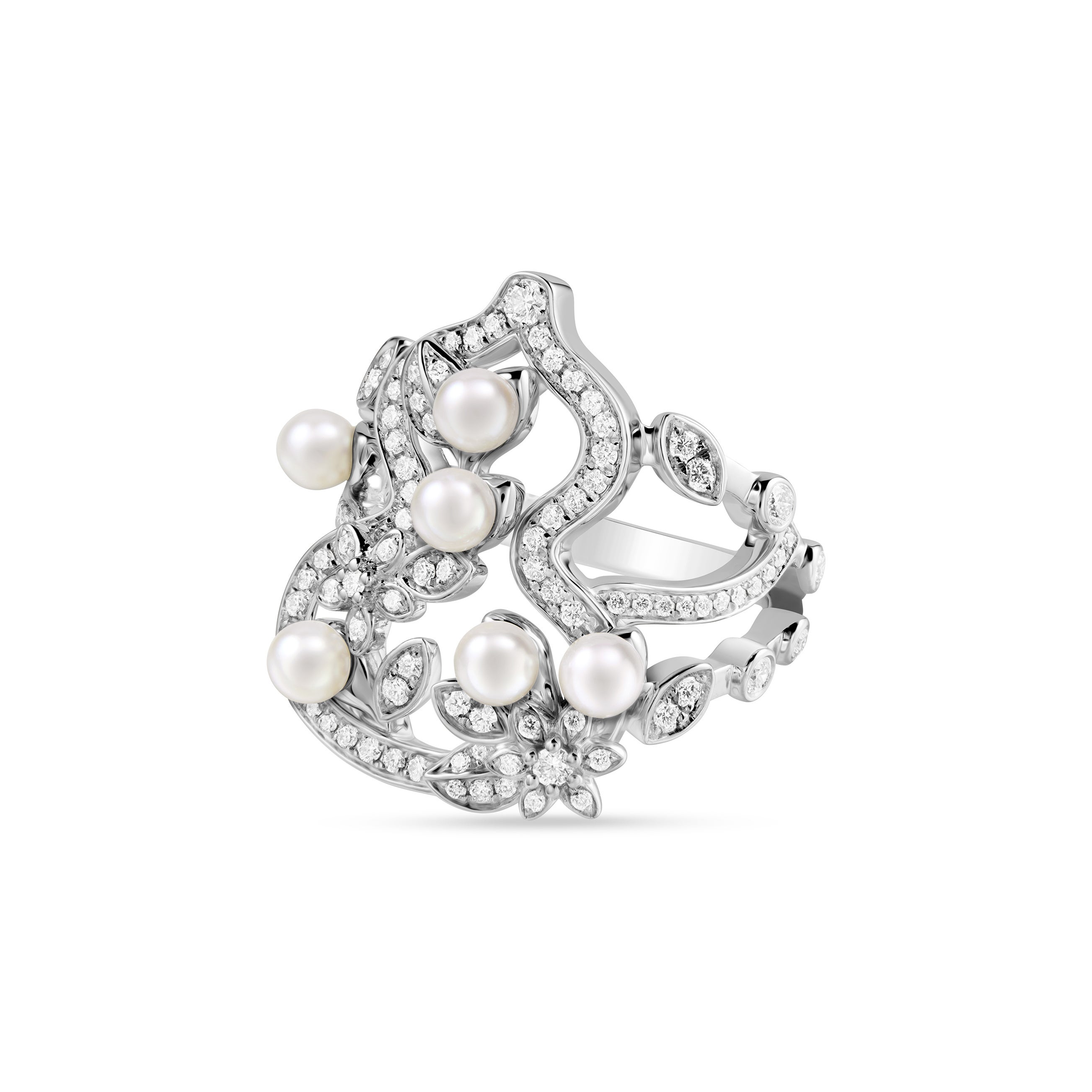 新作〝 Wulu Garden リング 〟は、もうひとつの春の物語を紡ぎます。18Kホワイトゴールドとダイヤモンドで仕立てられたデザインは、Wuluのシルエットに繊細な蔓が優美に絡み合い、花々が咲き誇る庭園の情景を想起させます。6粒のアコヤパールは葉先にきらめく朝露のように瑞々しく輝き、永遠性と調和の美を象徴しています。また、コレクションには、ダイヤモンドとルビーをあしらったローズゴールドのデザインもラインナップ。満開の花々を思わせる華やかさと、生命力溢れたエネルギーを湛えています。このふたつの解釈を通して、Wulu Garden シリーズが持つ多面的な美意識と詩的な余韻がいっそう鮮やかに描き出されます。