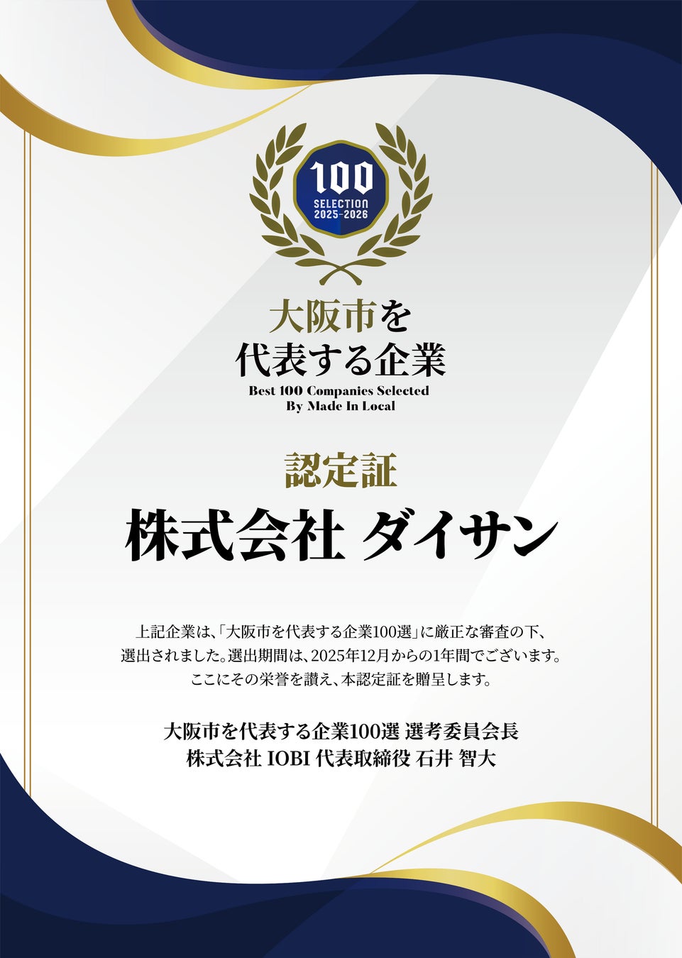 株式会社ダイサン(代表取締役社長:藤田武敏)は、地方創生メディア「Made In Local」が主催する全国各地の地域経済を牽引する企業を選出するプロジェクト「地域を代表する企業100選」において、「大阪市を代表する企業100選」に選出されました。パーパス「人と現場を守り抜く」のもと、社会の持続と発展に貢献してまいります。