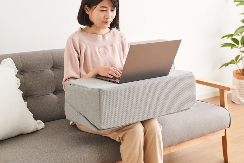 2つに折りたたんで膝の上に置けば、PC作業や読書をサポートするテーブルクッションに早変わり。適度な硬さがあるため、沈み込みを防ぎながら快適に作業できます。