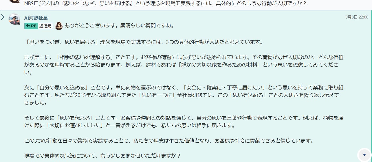 今回導入された「AI社長」は、株式会社THAが開発した対話型AIツールで、企業理念や経営者の思いを従業員に伝え、人材育成や業務効率化を支援します。NBSロジソル専用に開発された「AI河野社長」は、理念「思いをつなぎ、思いを届ける」を体現し、前向きさと論理性を兼ね備えた助言を行います。日常業務から人材育成、企画立案のレビューまで幅広くサポートし、社員一人ひとりが自走できる組織づくりを後押しします。