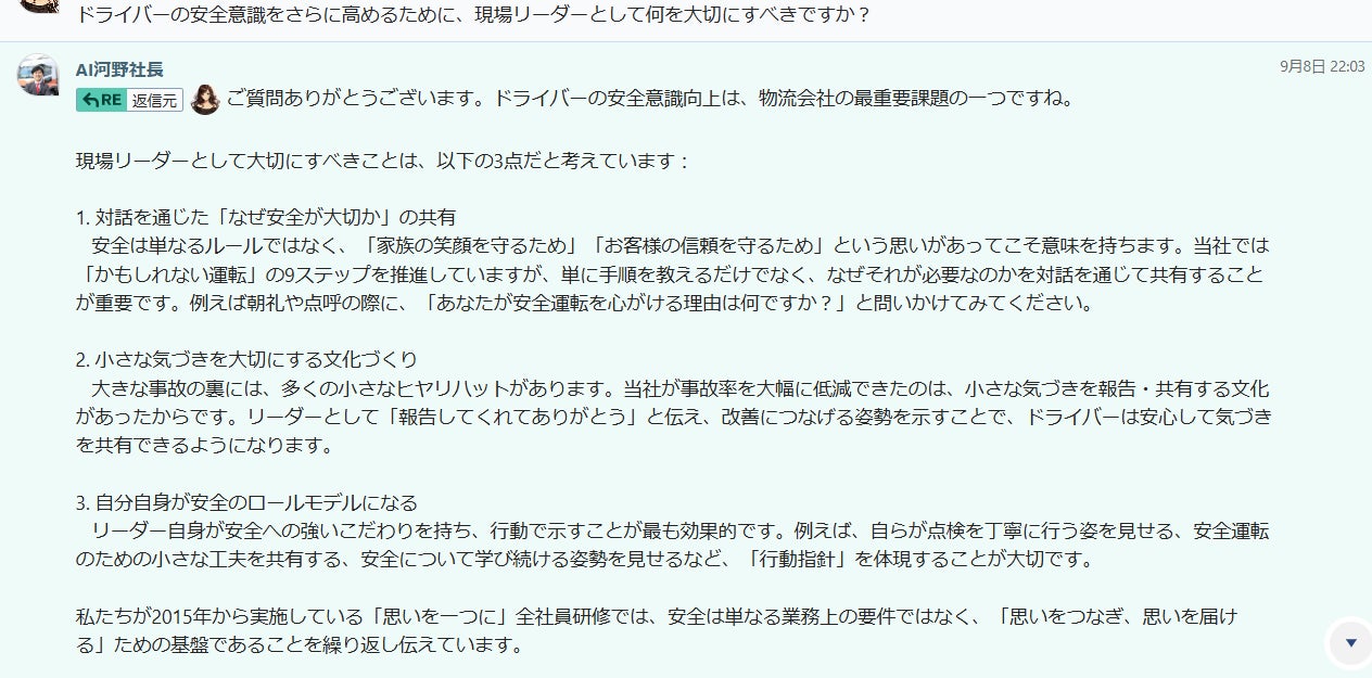 物流業界は人材育成と理念浸透が特に重要な業界です。『AI河野社長』が河野社長の前向きでありながら論理的な思考を体現し、マネージャーの皆様が理念に基づいた具体的な指針を部下に伝えられる環境を実現できることを確信しています。