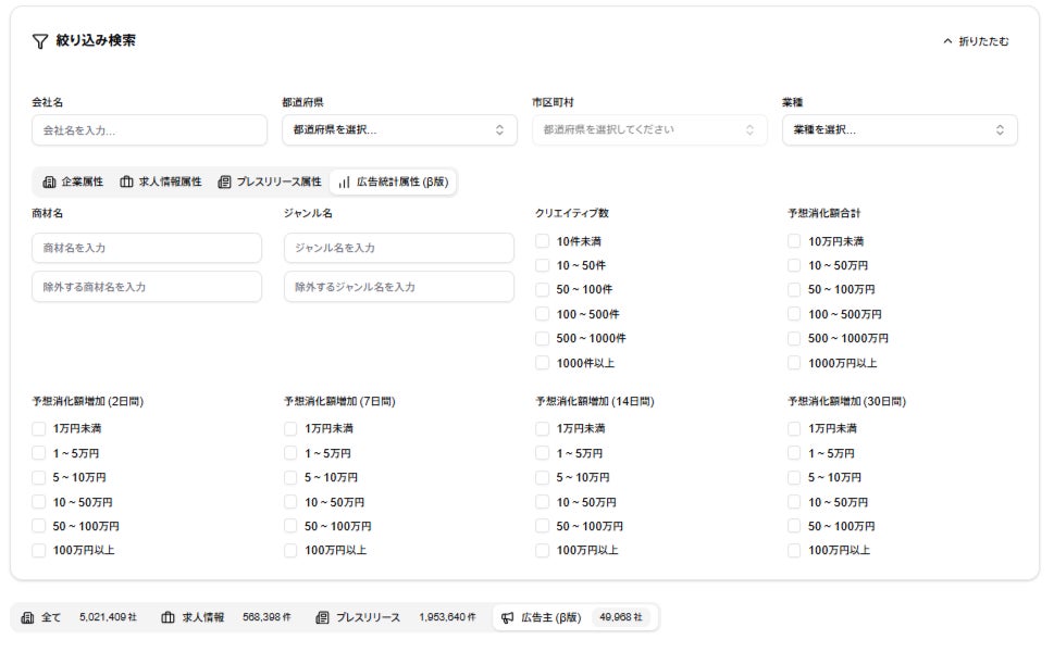 「AIアポろうくん」に新たに追加された「広告統計属性リスト」は、500万社以上の企業データベースと、Web上の広告出稿データを連携させた新機能です。添付画像の通り、以下の指標で企業リストをリアルタイムに絞り込むことができます。