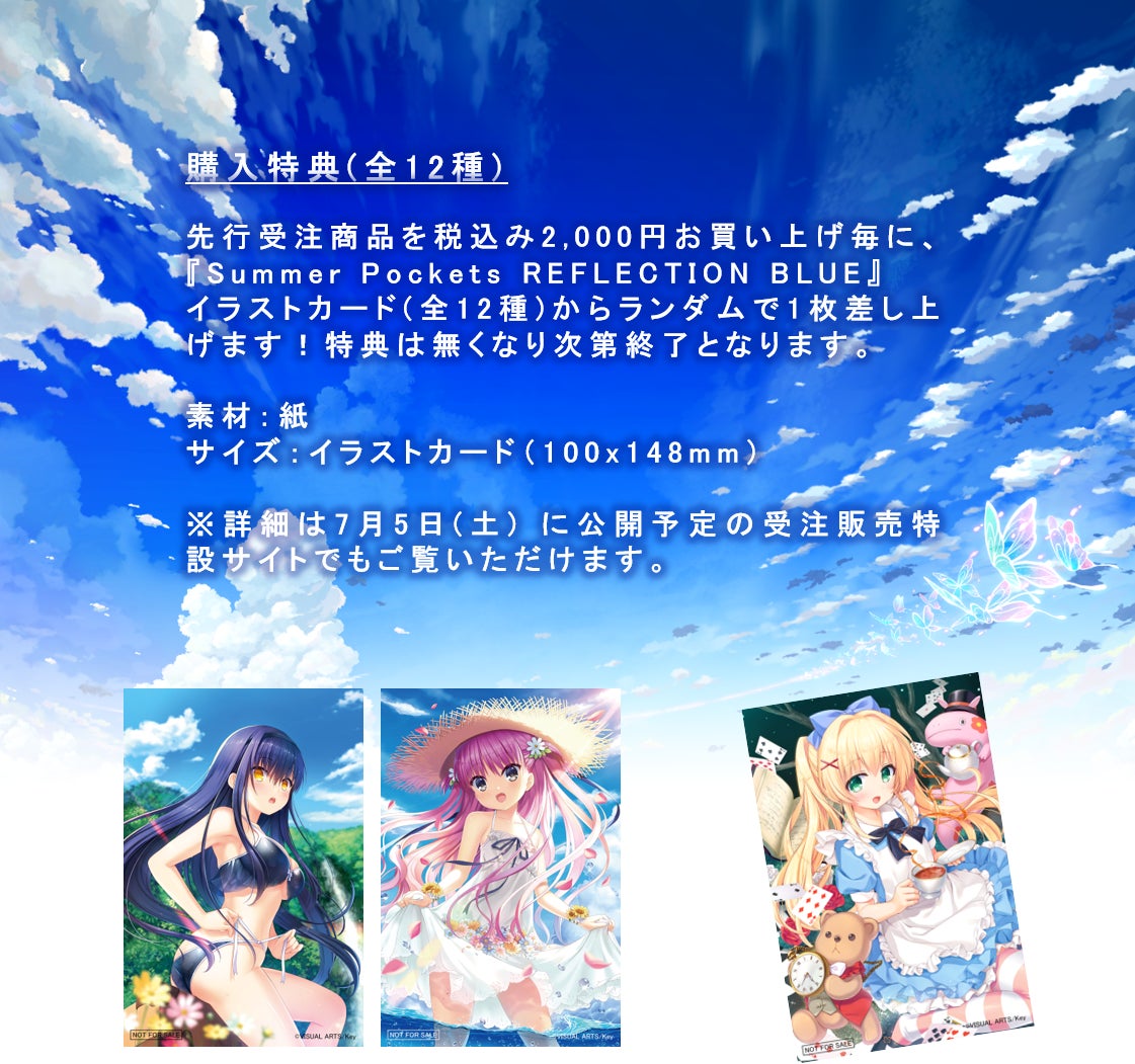 先行受注商品を税込み2,000円お買い上げ毎に、 『Summer Pockets REFLECTION BLUE』ポストカード(全12種)からランダムで1枚プレゼント!