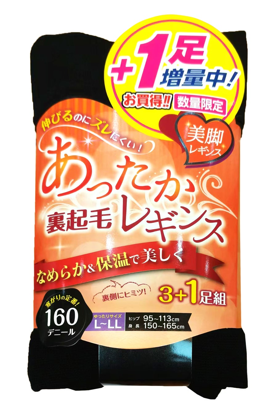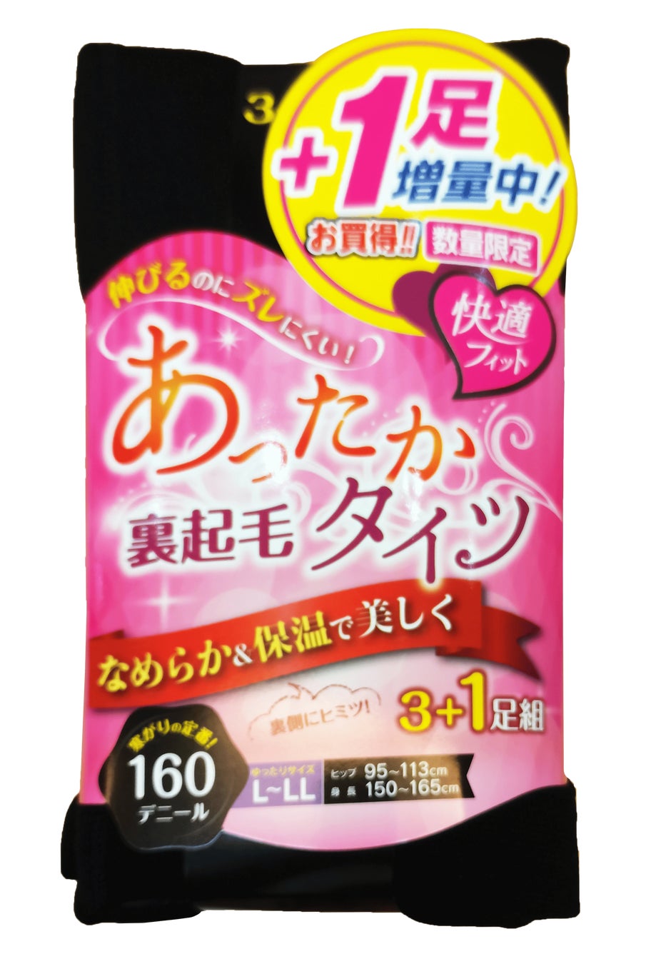 伸縮性に優れ、ズレにくい設計で、肌に当たる裏面を起毛させることによって暖かさを実現しました。160デニールの厚みがあり、保温性に優れつつ服に響きにくいのも特徴です。また、昨年の3足組から4足組へと増量し、よりお得にご提供いたします。
