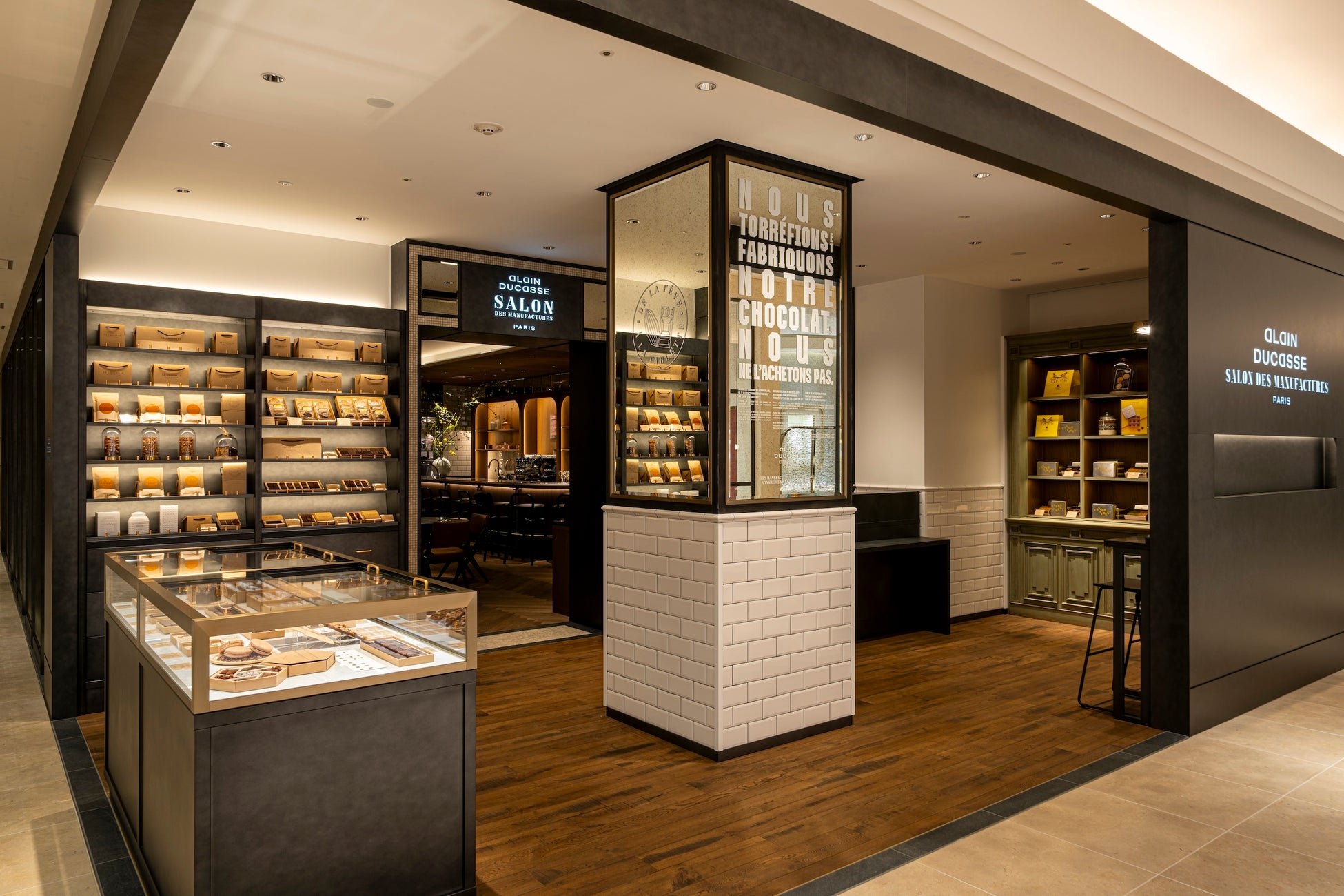 店頭には、ショコラ専門店「ル・ショコラ・アラン・デュカス」とビスケット専門店「ル・ビスキュイ・アラン・デュカス」のブティックも併設。人気商品をはじめ、ここでしか手に入らない限定商品を販売します。
