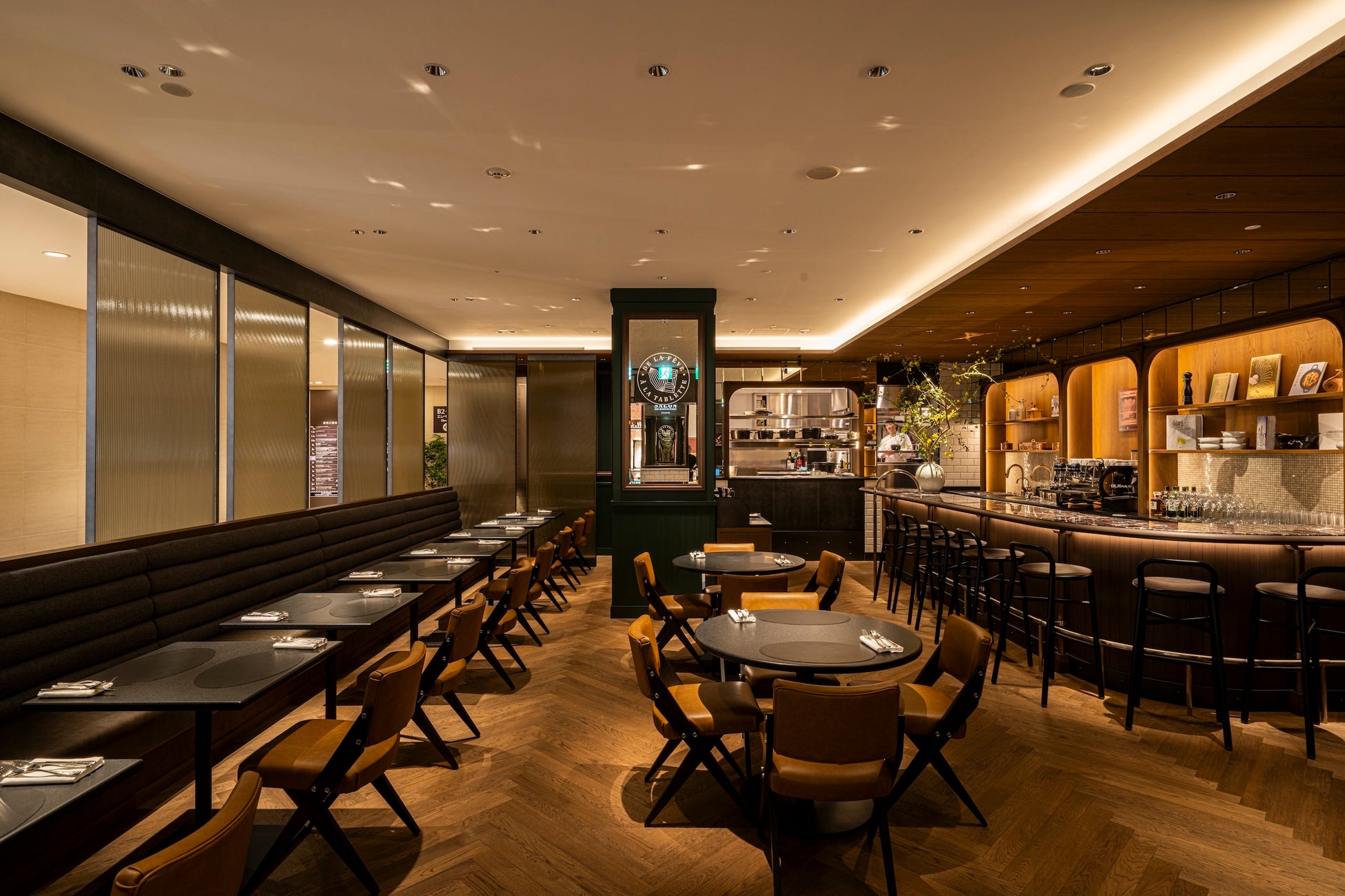 アラン・デュカスの哲学を取り入れ、クラシックとモダンを融合させた空間。天然木と天然石にスチールの質感を合わせ、ダークグリーンとゴールドのアクセントを効かせた空間は洗練されながらも心地よく、どこか親しみやすさを感じさせます。メインダイニングに加え、カウンター席、ボックスシート席、個室をご用意。入り口には「ル・ショコラ・アラン・デュカス」「ル・ビスキュイ・アラン・デュカス」のブティックも併設しました。