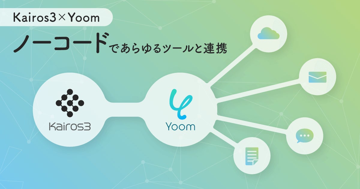 “次の一手“がデータでわかるMA+SFA一体型ツール「Kairos3(カイロススリー)」を提供するカイロスマーケティング株式会社(本社:東京都渋谷区、代表取締役:佐宗 大介)は、Yoom株式会社(本社:東京都千代田区、代表取締役:波戸﨑 駿)が提供するハイパーオートメーションツール「Yoom」の連携アプリとして、MAツール「Kairos3 Marketing」・SFAツール「Kairos3 Sales」が追加されたことをお知らせします。