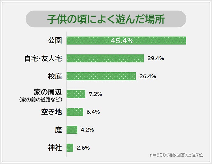 子供の頃によく遊んだ場所のダントツは「公園(45.4%)」で、全体の4割以上を占めました。2位「自宅・友人宅(29.4%)」、3位「校庭(26.4%)」も多くなっています。