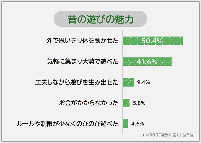 昔の遊びの魅力を聞いたところ、もっとも多かった回答は「外で思いきり体を動かせた(50.4%)」、2位は「気軽に集まり大勢で遊べた(41.6%)」でした。
