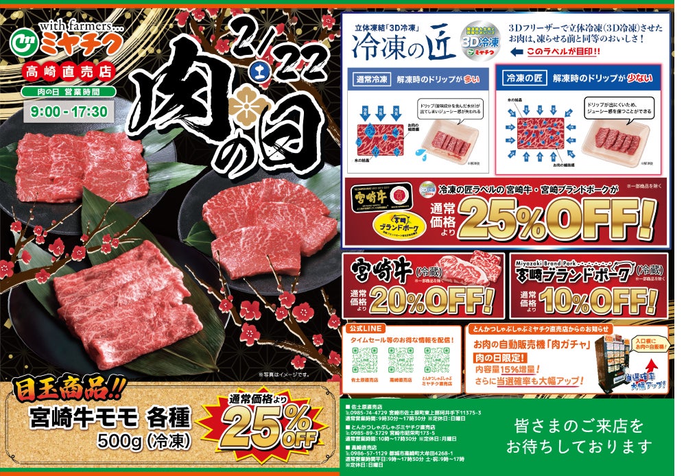 株式会社ミヤチク(本社:宮崎県都城市/代表取締役社長:船ヶ山 祐二)が運営する「宮崎牛」「宮崎ブランドポーク」「ハム・ソーセージ」を取り扱う直売店(宮崎県内3店舗)にて、2/22(土)にお肉が割引価格でお買い求めいただける「肉の日」を開催します。さらに!佐土原直売店では、15周年を迎え。お客様に感謝を込めた“感謝セール”も同時開催!