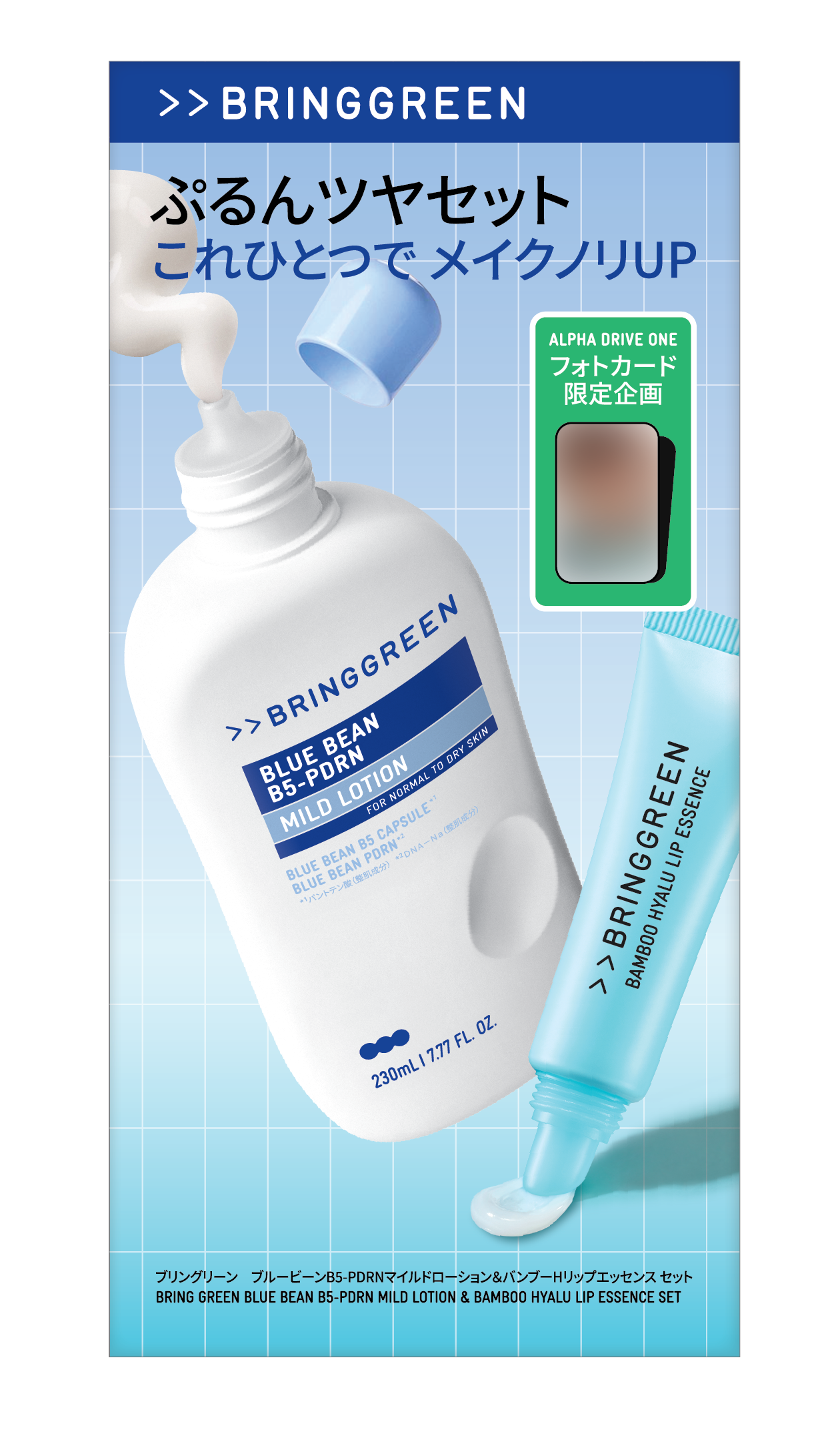 ブリングリーン独自の保湿成分「ブルービーン B5-PDRN™*¹」を配合し、お肌の水分・油分バランスを整え、肌バリアをサポートしながらしなやかなお肌へ導く乳液と、寝る前の集中ケアにもデイリーリップケアにも使えるリップエッセンスのセットに、ALPHA DRIVE ONEのフォトカードが2枚封入された特別セット。ALPHA DRIVE ONEがブランドアンバサダーに就任後、初の日本向け企画セットです。