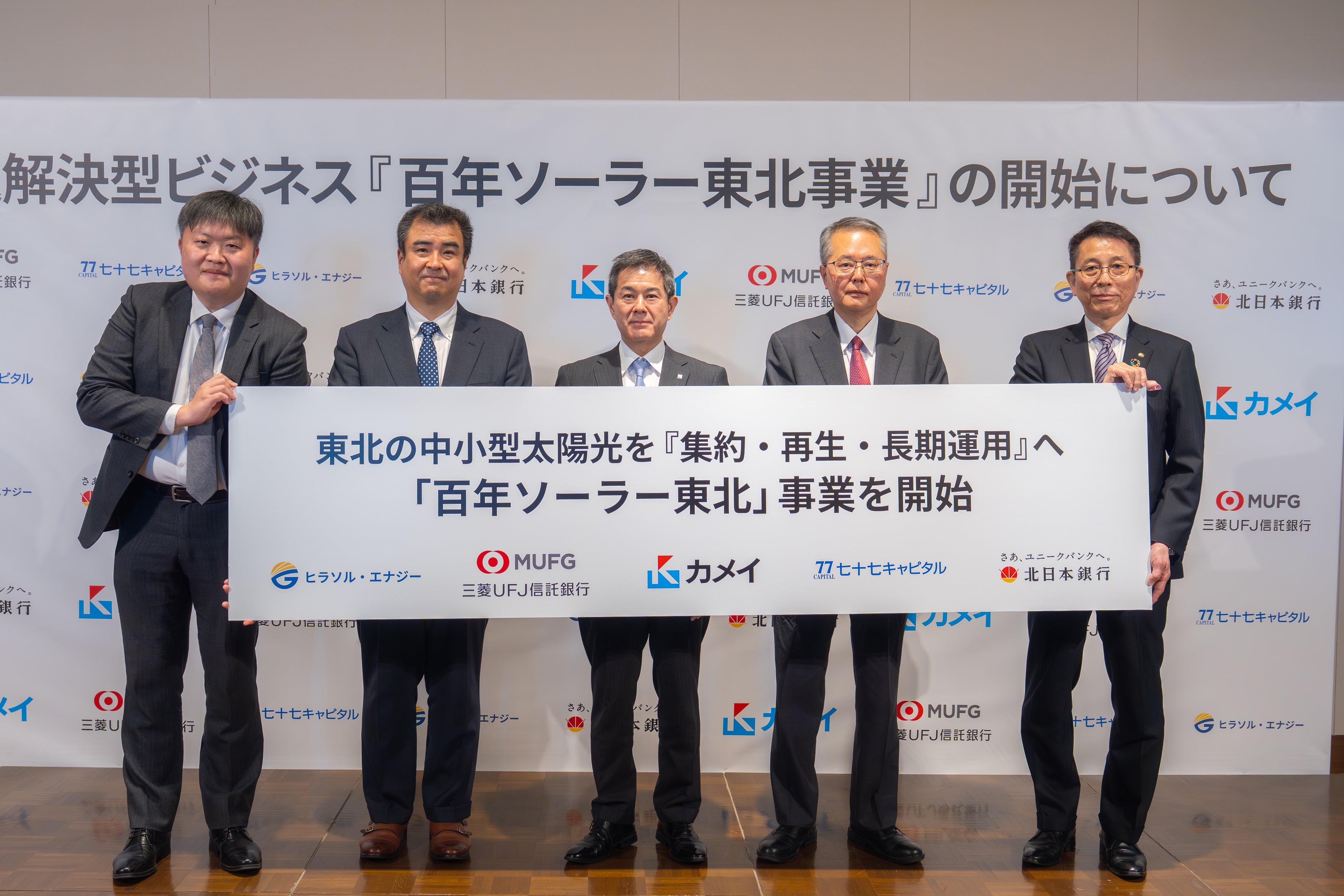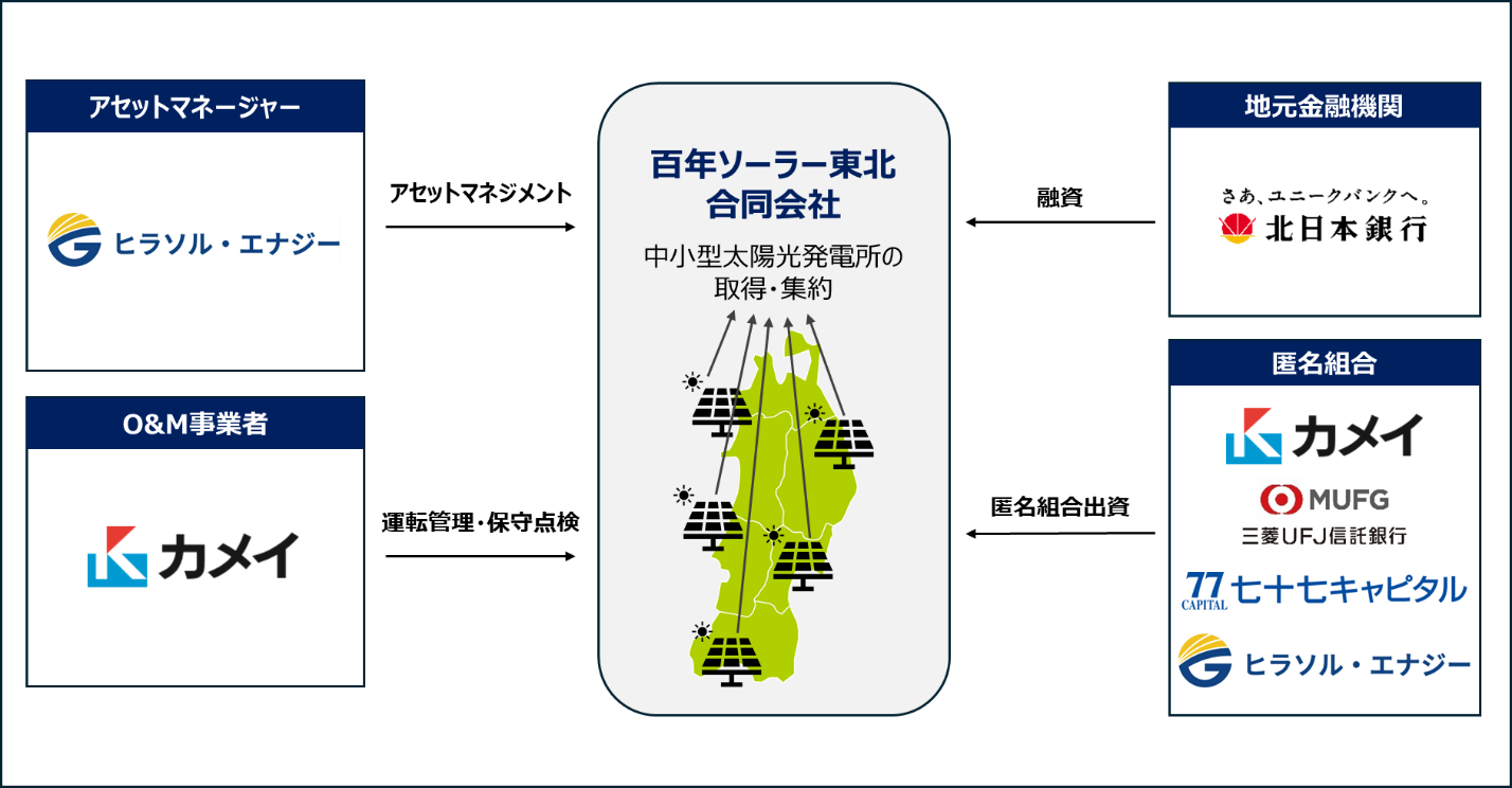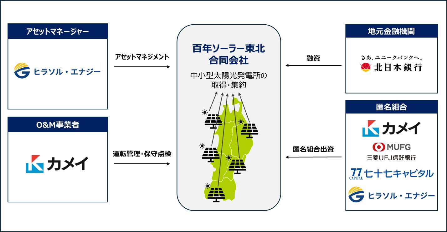 カメイ株式会社(本社:宮城県仙台市、代表取締役社長:亀井 昭男、以下「カメイ」)、三菱UFJ信託銀行株式会社(本社:東京都千代田区、取締役社長:窪田 博、以下「三菱UFJ信託銀行」)、七十七キャピタル株式会社(本社:宮城県仙台市、取締役社長: 今野 晃 )が運営する77ストラテジック・インベストメント第2号投資事業有限責任組合(以下「七十七キャピタル」)、ヒラソル・エナジー株式会社(本社:東京都文京区、代表取締役:李 旻、以下「ヒラソル・エナジー」)は、東北エリアの太陽光発電所を取り巻く廃棄・放棄課題の解決と長期安定稼働による脱炭素化を推進するために、「百年ソーラー東北合同会社(以下「百年ソーラー東北」)」と匿名組合契約を締結し、百年ソーラー東北は株式会社北日本銀行(本店:岩手県盛岡市、取締役頭取:石塚 恭路、以下「北日本銀行」)とプロジェクトファイナンス契約を締結いたしました。