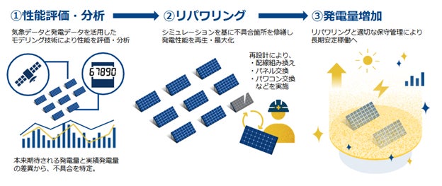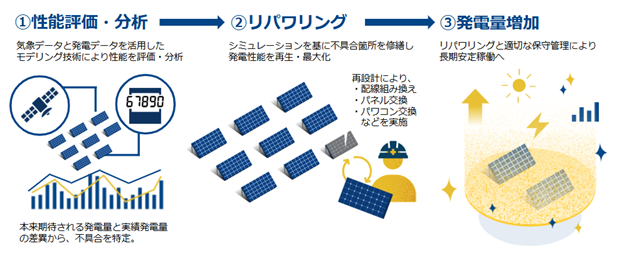 「百年ソーラー東北」では、2029年までに東北エリアにある中小型太陽光発電所合計10MWの取得を計画しております。取得した太陽光発電所はアセットマネージャーを担うヒラソル・エナジーの技術を活用して性能評価・分析を実施し、必要に応じで本来期待される発電量に回復させるリパワリングを行います。ヒラソル・エナジーは、独自に取得した気象データと30分単位の発電データを活用したモデリング技術により、発電所の性能の強弱や課題を特定し、確実な手法で太陽光発電所のリパワリングを実施します。これまでにも発電性能を向上させた実績として、山梨県における「百年ソーラー山梨株式会社」で合計1MW、18カ所の発電所の集約・運営を実施しています。