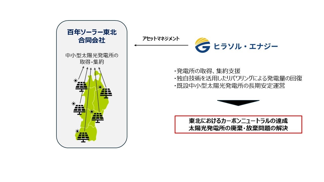この課題解決のため、東北エリアの中小型太陽光発電所を取得・集約し、ヒラソル・エナジーの強みである「リパワリング技術」と「デジタル技術」を活用した長期安定運営を目的として「百年ソーラー東北」を新設し、カメイ、三菱UFJ信託銀行、七十七キャピタル、ヒラソル・エナジーの4社がそれぞれ匿名組合契約を締結します。また、地元金融機関である北日本銀行からのプロジェクトファイナンスを通じ、FIT期間終了後も見据えた長期安定運営を支える金融基盤を整備し、地域金融と一体となった東北エリアの社会課題解決プロジェクトとして推進してまいります。