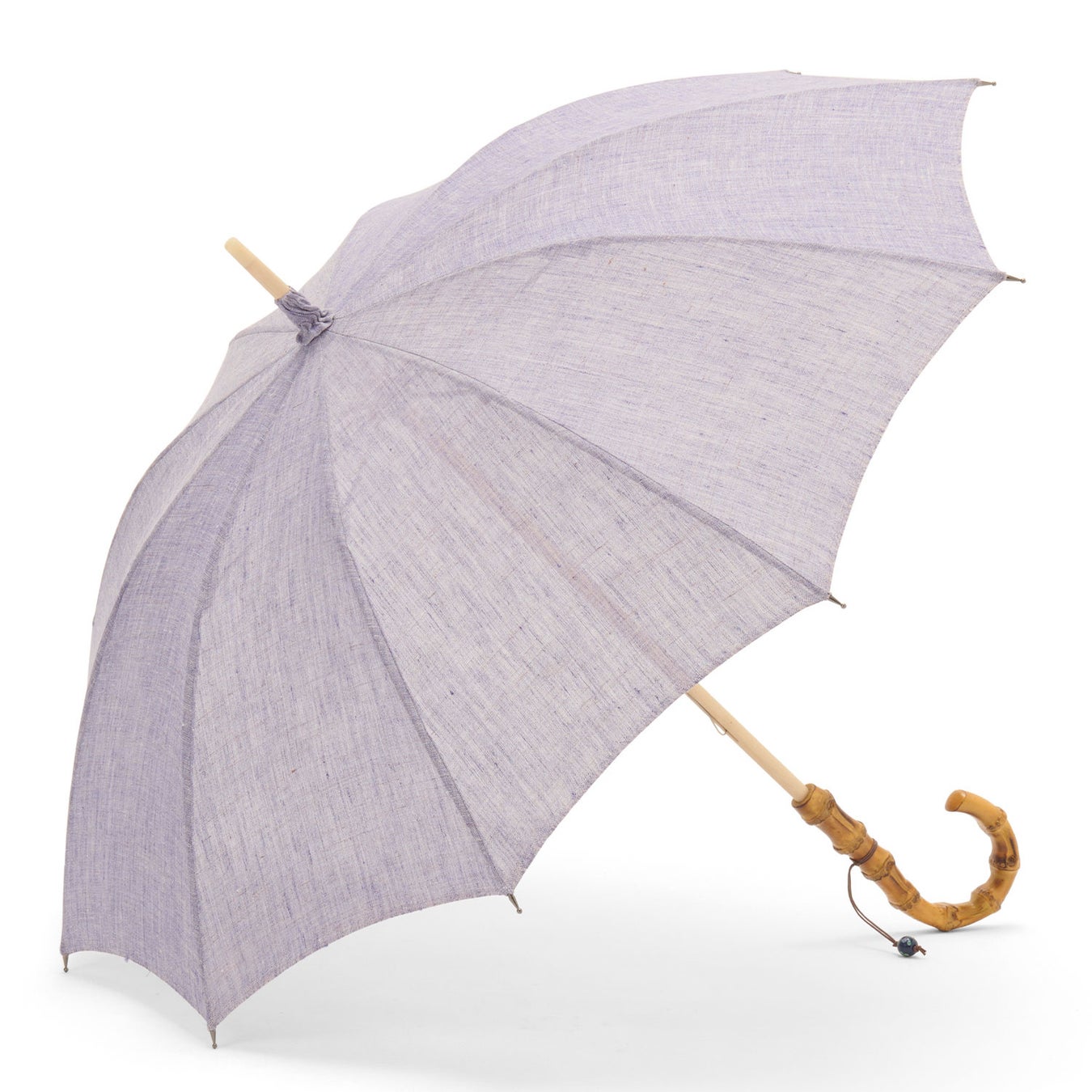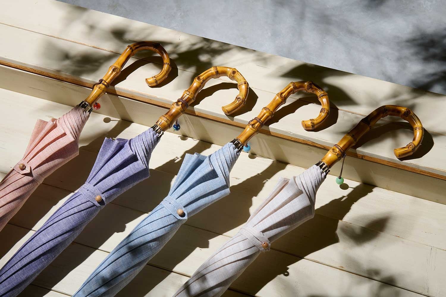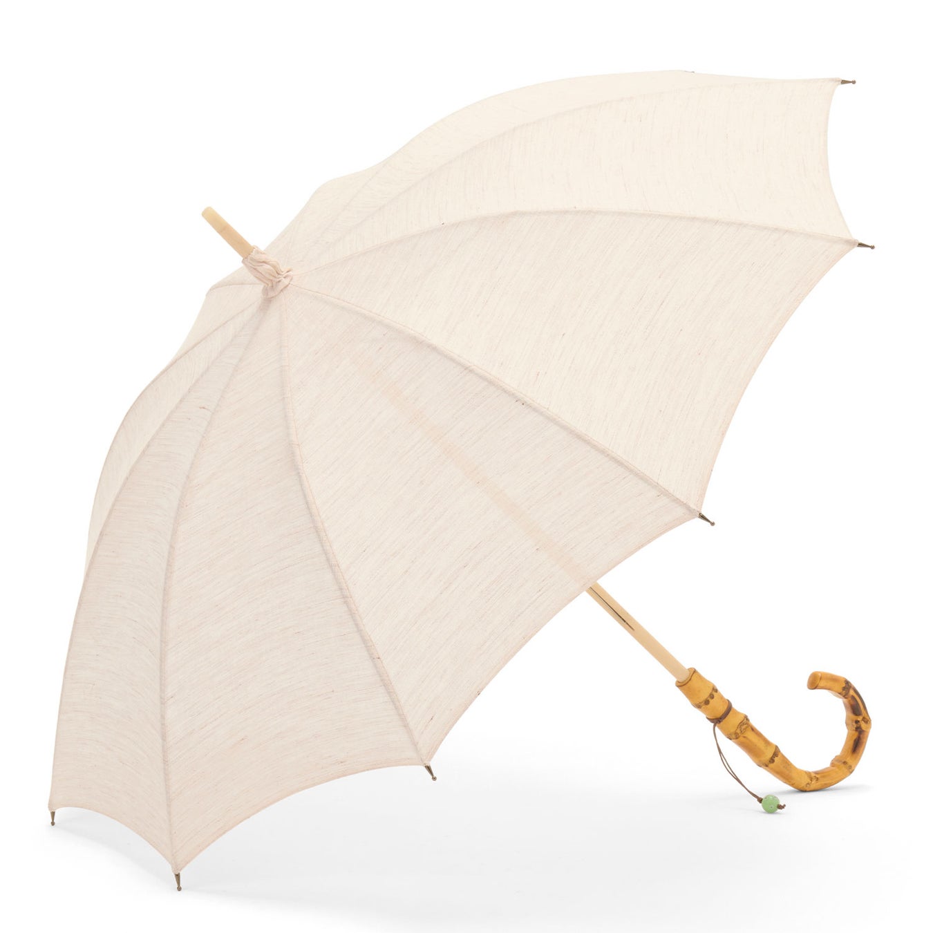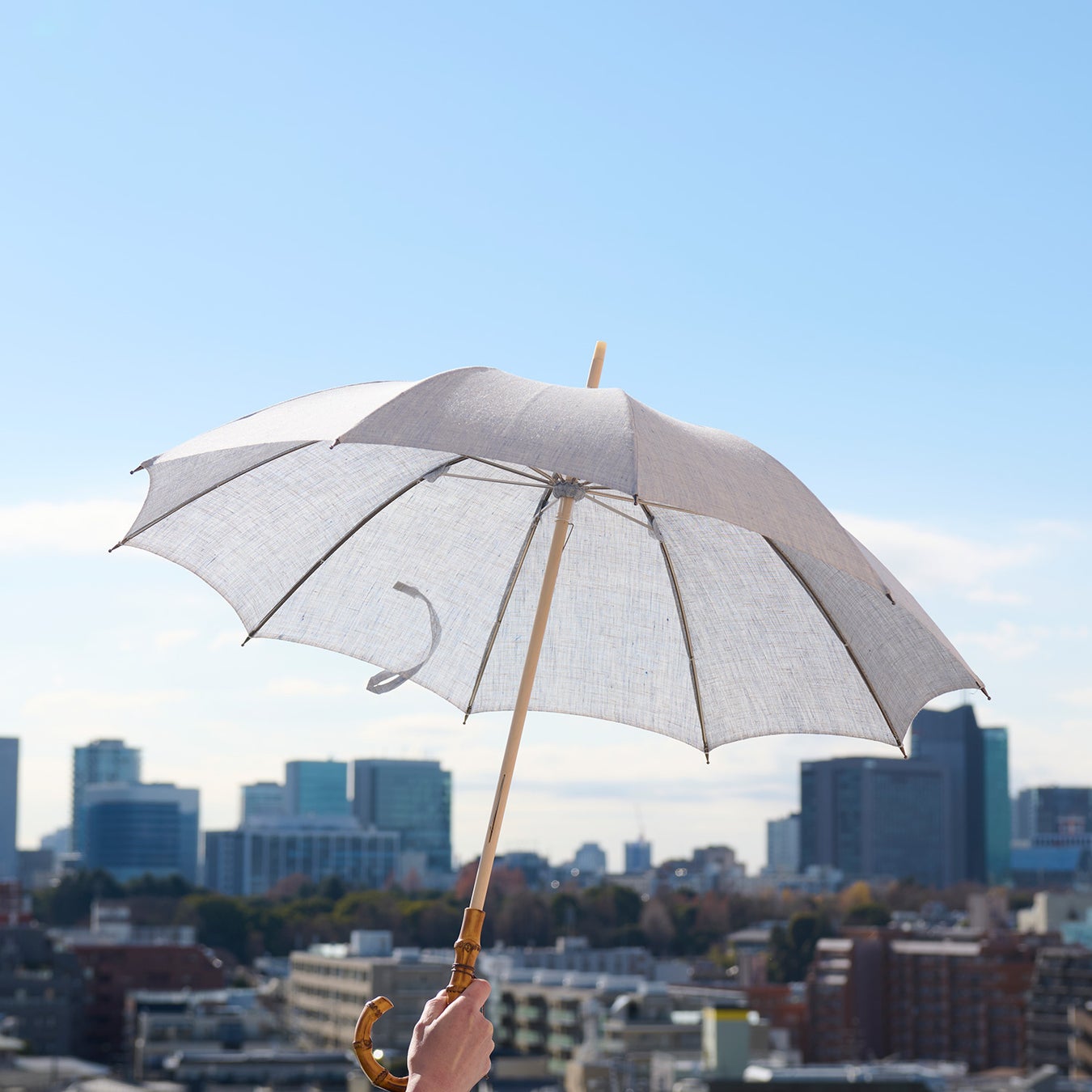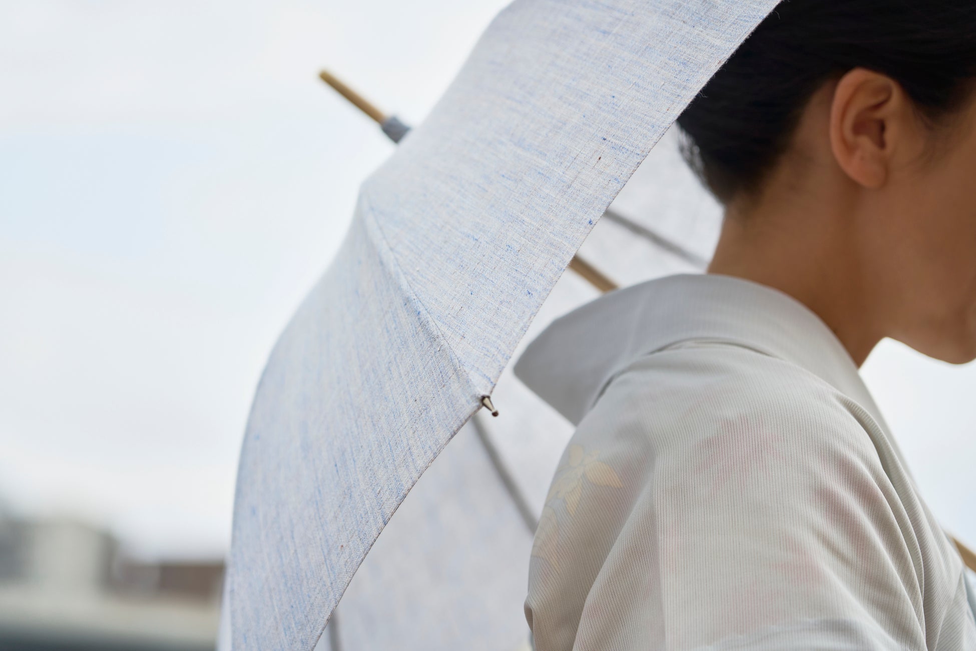 山梨の工房で丁寧に織られた生地を、京都の傘職人が仕立てる”メイドインジャパン”にこだわったパラソル「織風」。麻ならではのふんわりとした素材感を大切に、傘を開いても閉じても美しいシルエットにこだわりました。昔ながらのレトロな麻日傘は、和装はもちろん持つだけで風情漂う優雅なアイテムです。もちろん和装にもピッタリな「着物に合う傘」です。初夏のお出かけのお供に是非ご利用いただきたい一本です。