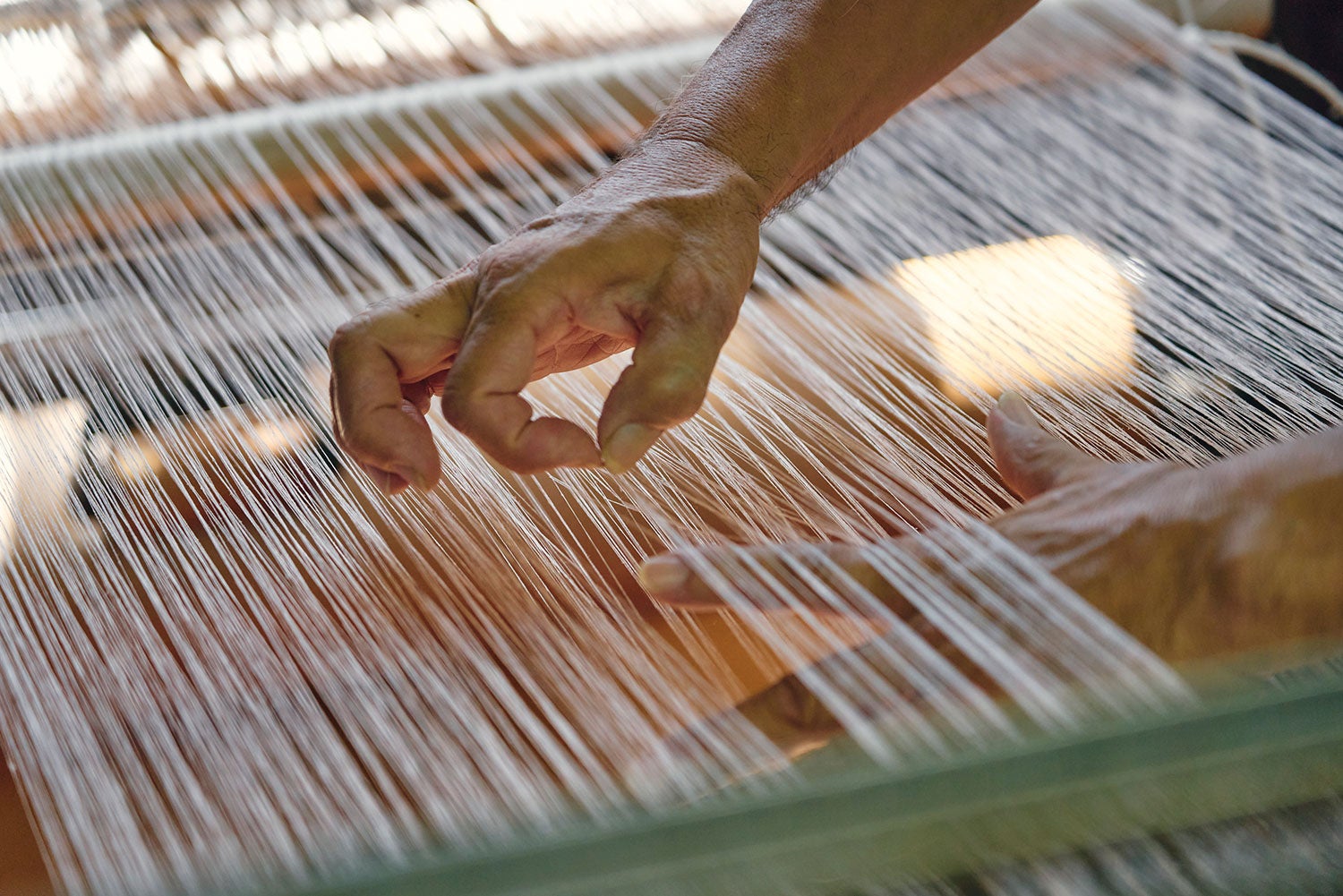 麻の原糸は玉があるため引っ掛かりやすく、その都度手で優しくほぐしながら織ります。つきっきりで見守りながら、一日で織れるのは数メートル。