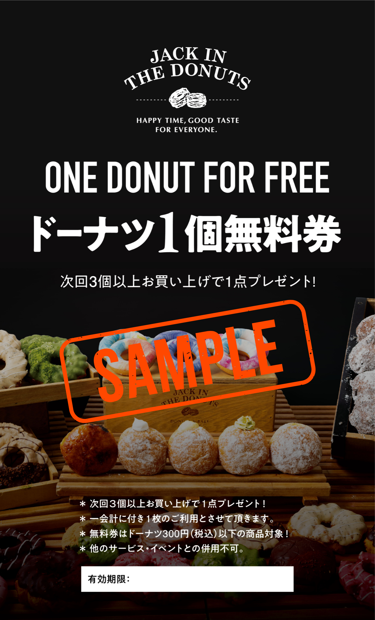 実施内容:ドーナツ1,500円(税込)以上お買い上げでドーナツ1個無料券をプレゼントします。