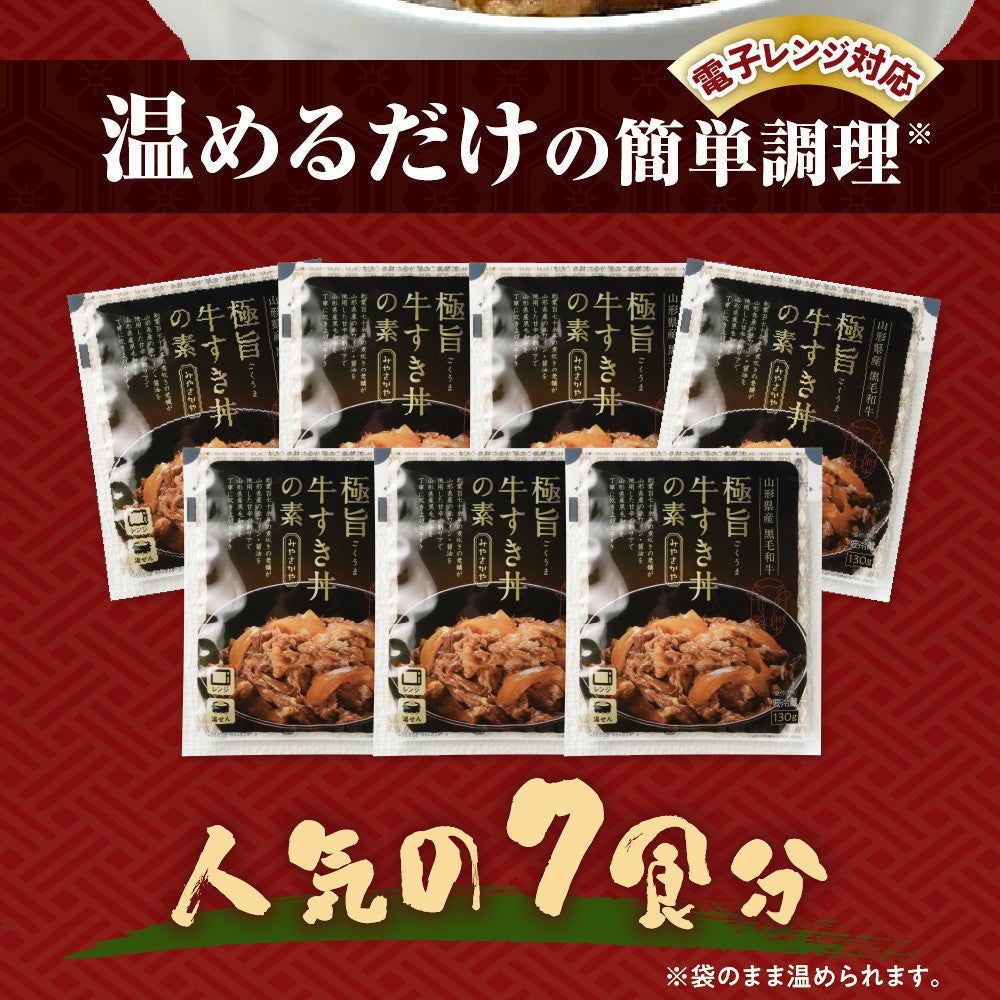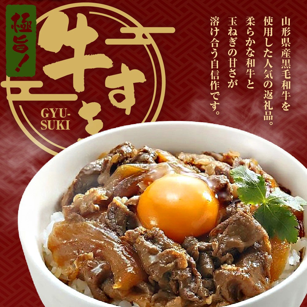 高品質の山形県産黒毛和牛100%使用した『極旨牛すき丼の素』。赤身と脂身のバランスが良く、山形県産の赤ワインを隠し味に使用した割り下の甘辛タレが牛肉とよく合い、ご飯が止まらなくなる味わいです。お好みでネギや卵を乗せて頂くと、さらに美味しくお召し上がり頂けます。