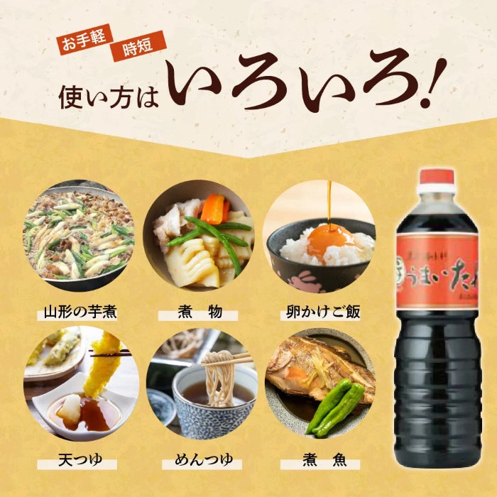 「ふるさとチョイス 醤油ランキング」で1位を獲得した、しょうゆ風万能調味料『うまいたれ』。厳選した本かつおだしをたっぷりと使い、豊かな風味と深みのある味わいで、麺つゆや鍋物のほか、シンプルに卵かけご飯で頂くのもよし。どんなお料理にも手軽に使えて毎日の食卓で活躍する一本です。