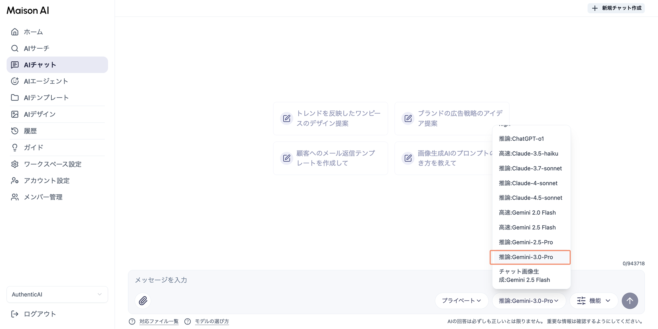 Maison AIにおいて、「Gemini 2.5」をはじめとするGeminiシリーズは、その高い言語能力と応答速度から、お客様に最も多くテキスト生成に利用され、高い評価を得てきました。今回、その次世代版である「Gemini 3 Pro」がいち早く登場します。「お客様に、世界最先端の技術をすぐに試していただきたい」という想いから、今回の実装に至りました。
