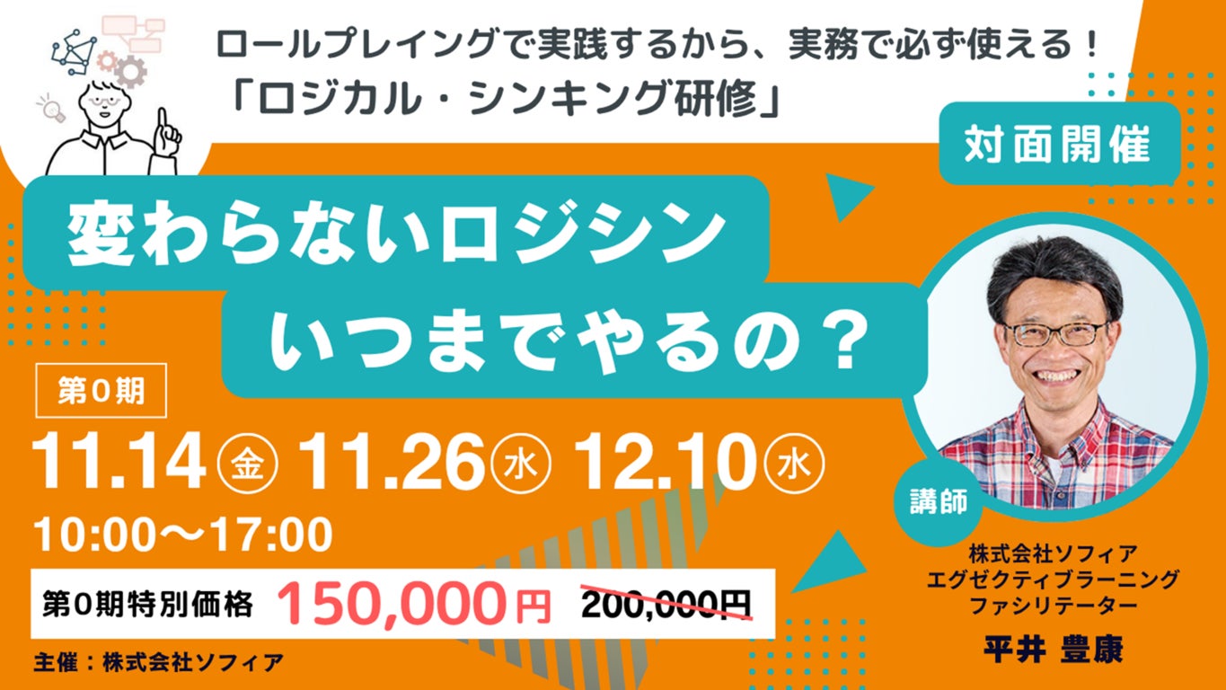 株式会社ソフィア(東京都港区麻布十番、代表取締役:廣田 拓也、以下ソフィア)は【11月14日㈮開催】【変わらないロジシン、いつまでやるの?】実務で使える「ロジカル・シンキング」本講座と題し、無料セミナーを開催します。