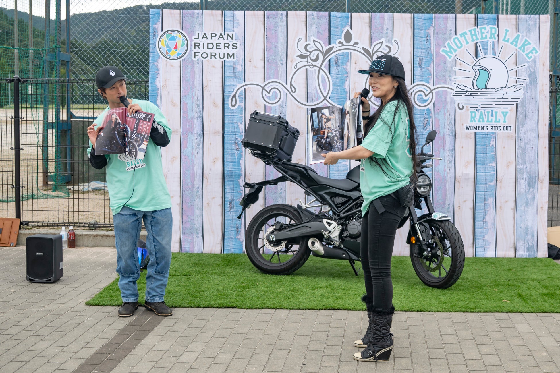 特設ステージでは、丸木舟での世界一周を目指すJomonさんこと雨宮国広氏による環境問題に関するトークショー、三好礼子氏とMC 山口世子氏による安全なバイクの楽しみ方についてのトークを展開。