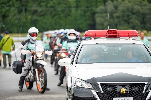 イベント2日目、10月19日(日)は、約40名の参加者によるパトカーとの合同走行を実施し、琵琶湖周辺の地域住民に対し、交通安全を啓発いたしました。女性ライダーが連なって走行する姿は、交通社会におけるライダーの存在感を示す壮観な光景となりました。