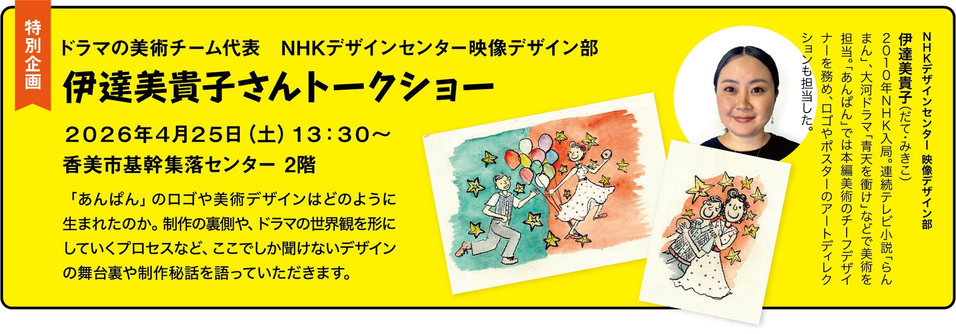 連続テレビ小説「らんまん」、大河ドラマ「青天を衝け」などで美術を担当された、伊達さんは「あんぱん」の美術チーフデザイナーとして、ロゴやポスターのアートディレクションにも携わられました。そのその伊達さんから、制作の裏側や、ドラマの世界観を形にしていくプロセスなど、ここでしか聞けないデザインの舞台裏や制作秘話を、貴重な資料と合わせて語って頂きます。