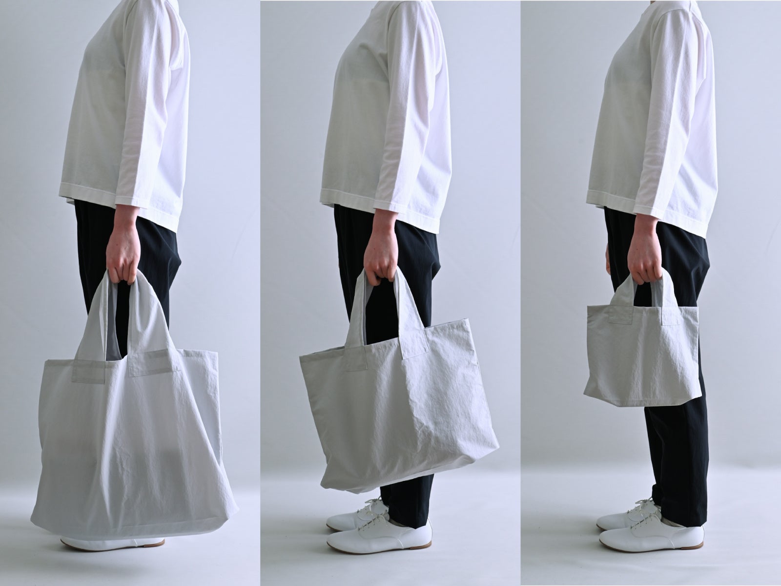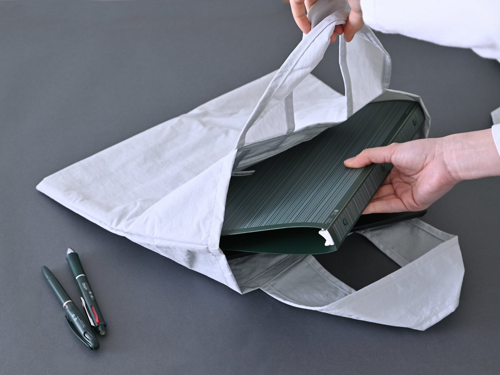 何色か生地のサンプルを作ったなかで、バッグの中身が透けにくく、ライトでニュートラルな印象のカラーリングに仕上がっています。