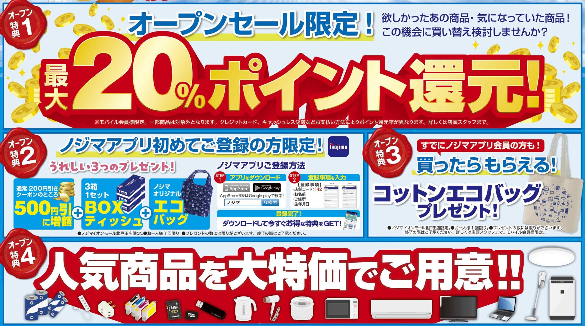株式会社ノジマ(神奈川県横浜市 代表執行役社長 野島廣司 以下「ノジマ」)は、「ノジマ イオンモール北戸田店」を「ノジマ 戸田駅前店」より移転オープンし、11月14日(金)~12月5日(金)の期間中、限定特価としてノジマポイントが20%還元になるお得なセールを開催いたします。地域最大級のショッピングセンターであるイオンモール北戸田にて、より便利に生まれ変わったノジマにぜひお越しくださいませ!