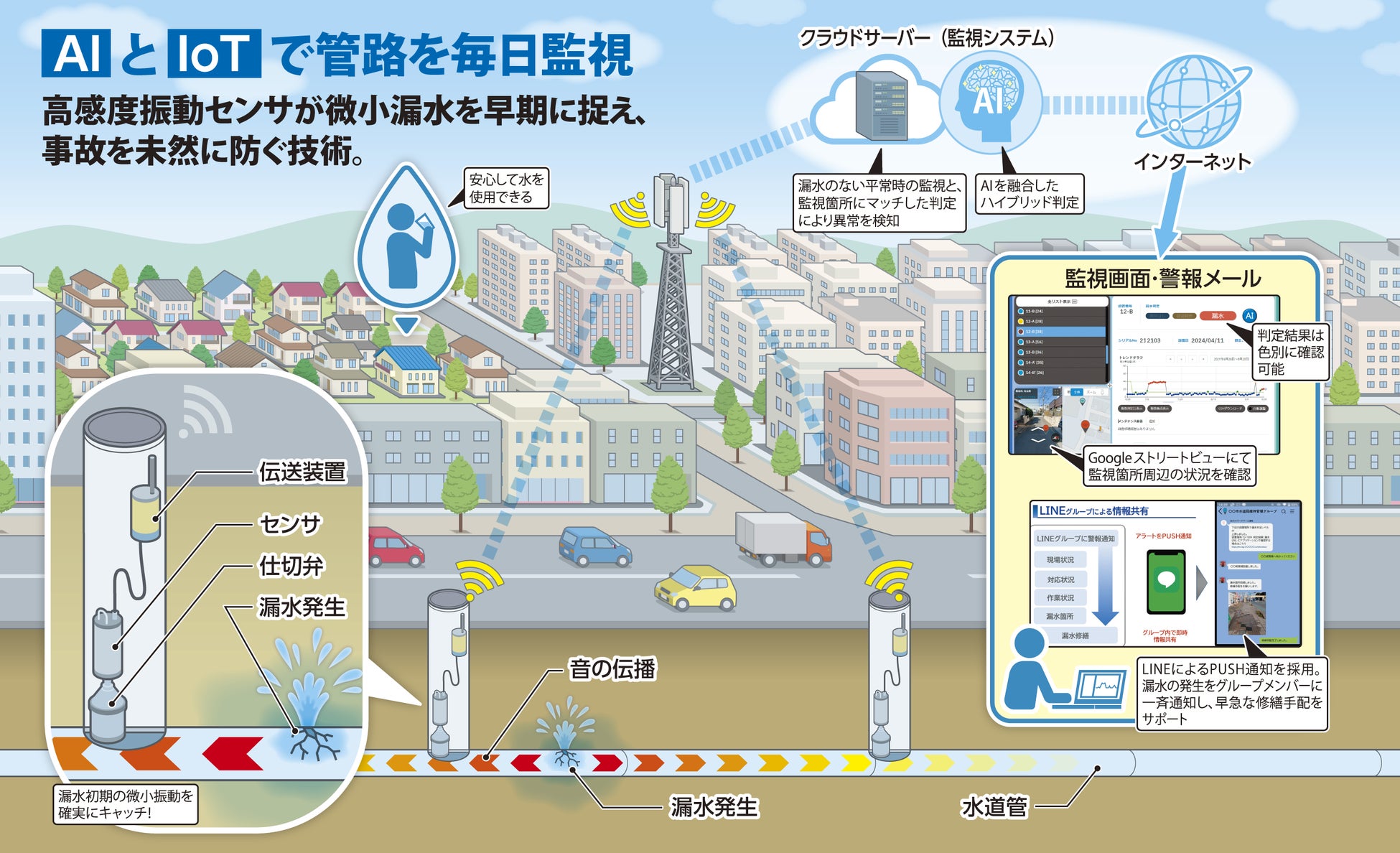 水道管に設置されたIoTセンサが漏水により発生する微小振動を日次モニタリングするシステムです。高感度センサが感知・記録したデータは、クラウド上に構築された独自アルゴリズムとAIを組み合わせた「ハイブリッド判定」により漏水と判断すると、スマートフォンやPCへメールやSNSを通じて即時に通知します。漏水の兆候が現れたタイミングで迅速な現場対応が可能となり、本システムは大規模な事故を防ぐ上で大きな力を発揮します。