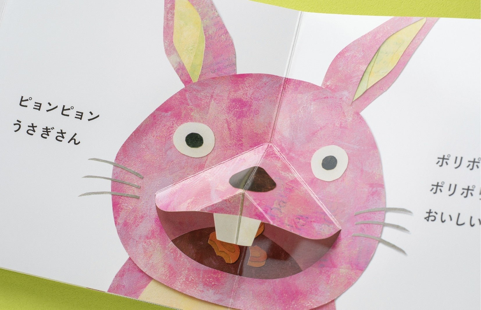 ページを開け閉めすると、ポップアップのしかけで、どうぶつたちの口がモグモグ、ムシャムシャと動きます。何度も繰り返して遊べ、親子での読み聞かせにもぴったりです。