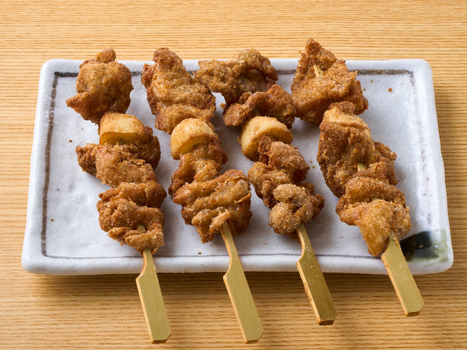 カリカリ、ホクホクの「鶏皮ニンニク揚げ串(4本)」399円(税込439円)