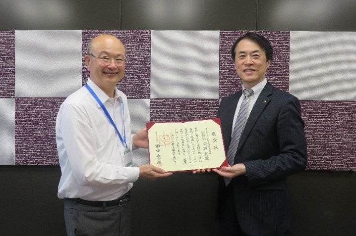 <写真>早稲田大学商学部 星野 明雄准教授(左)より感謝状を受け取る寄付講座責任者のプルデンシャル生命保険 立川 清明執行役員(右)