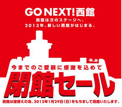 2012年1月29日(日)の西館の閉館までいよいよ秒読み。本当の売り尽くしセールがいよいよ大詰めに入りました。西館44店舗のアイテム をお値打ち価格でお買い求めいただける最後のチャンスです。