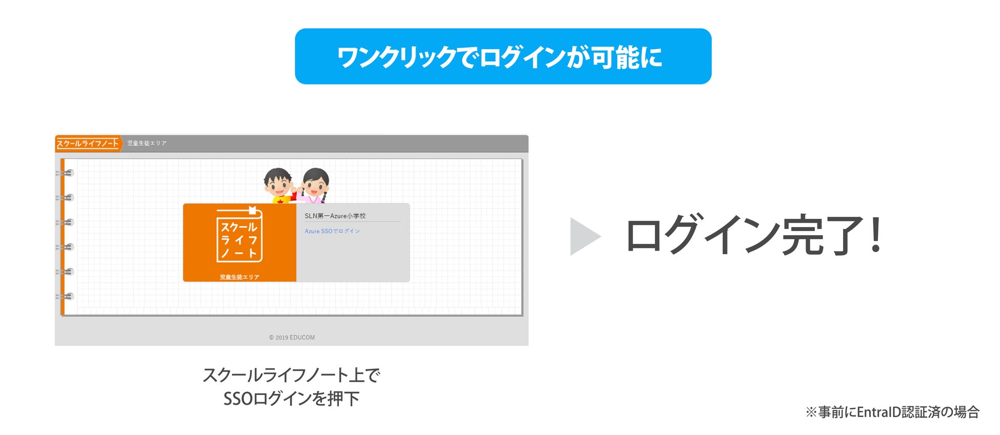 Entra ID に登録したアカウント情報で「スクールライフノート」にログインできるようになり、「スクールライフノート」上でIDやパスワードを入力する手間が解消されます。
